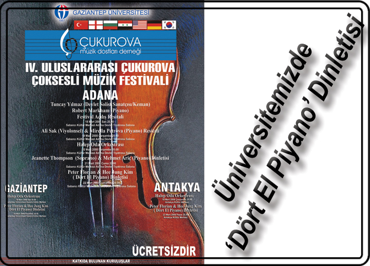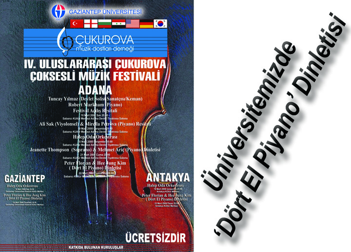 halep3.JPG“IV. Uluslararası Çukurova Çoksesli Müzik Festivali” çerçevesinde Gaziantep Üniversitesi ve Çukurova Müzik Dostları Derneği işbirliğiyle Üniversitemizde Dört El Piyano Dinletisi gerçekleştirilecektir.