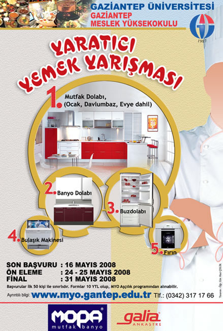 yemek_yarismasi.jpgGaziantep Üniversitesi Gaziantep Meslek Yüksekokulu Aşçılık Programı tarafından düzenlenecek olan “Yaratıcı Yemek Yarışması”na son başvuru tarihi 16 Mayıs 2008, Cuma günü sona eriyor.