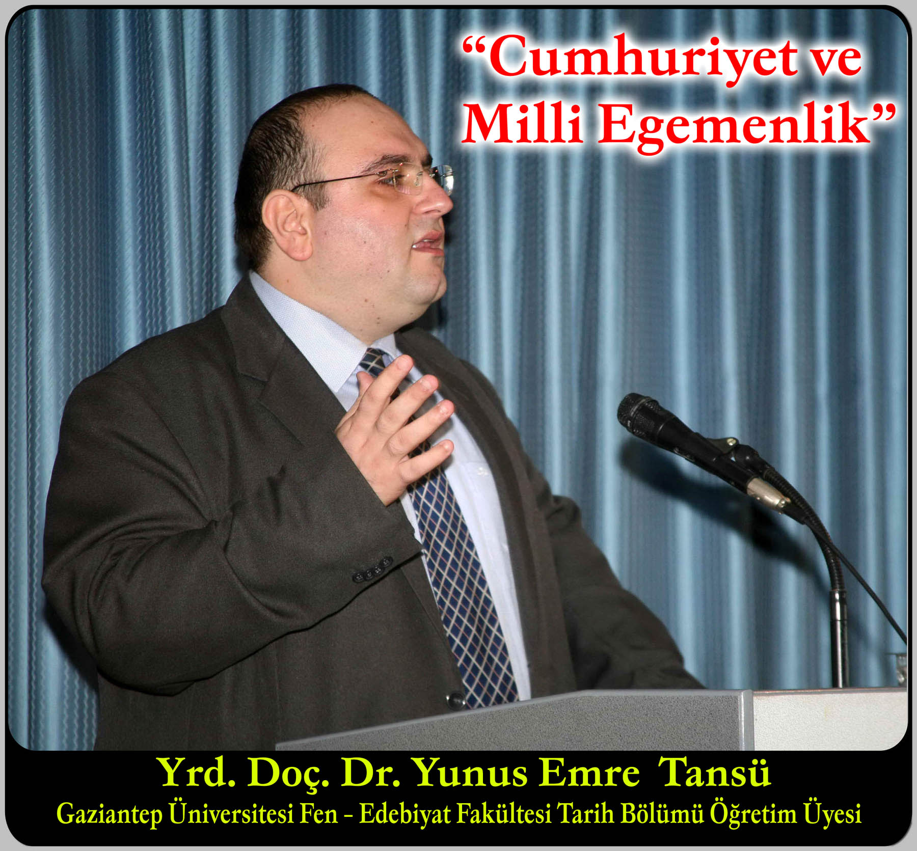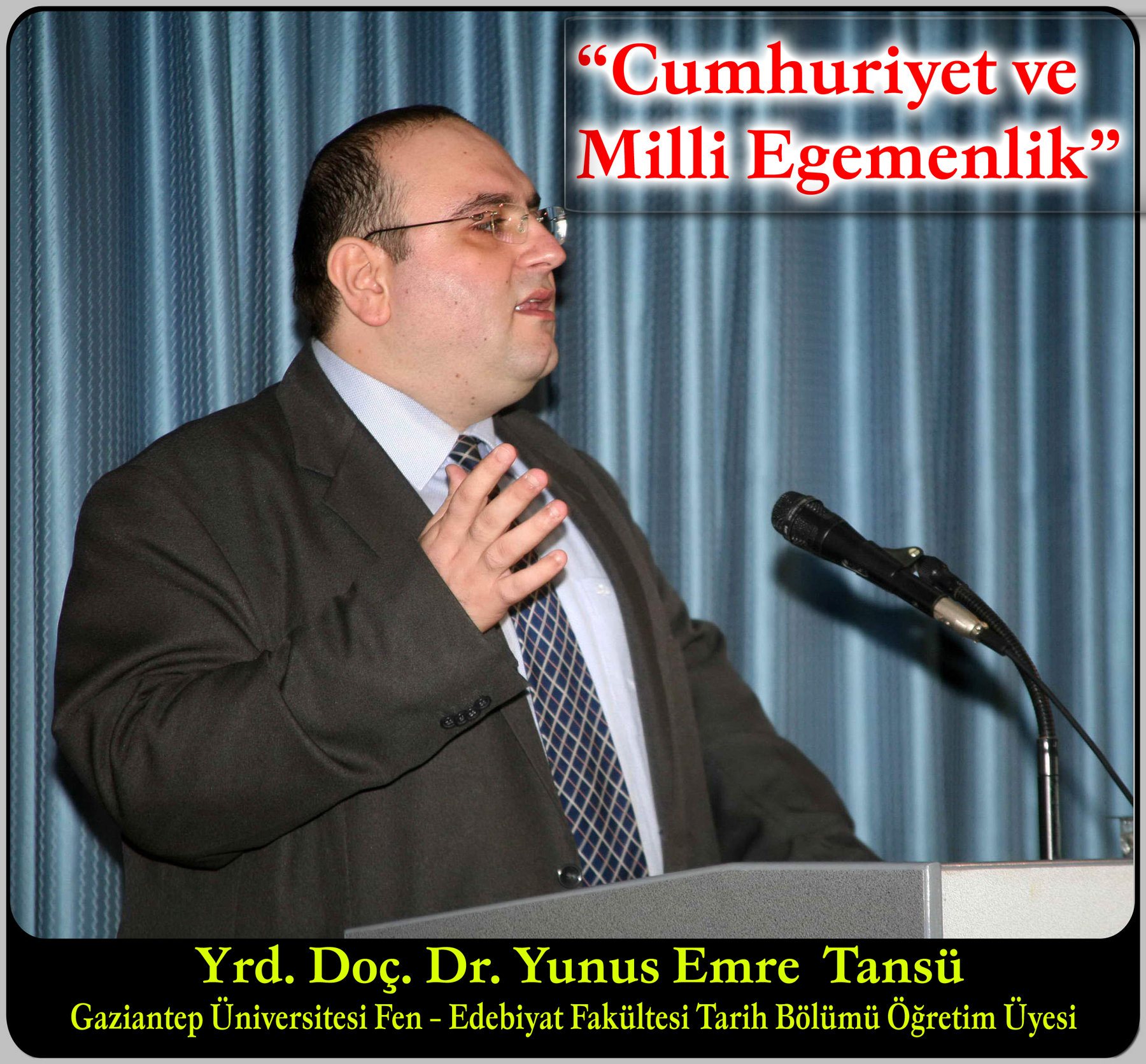 Gaziantep Üniversitesi Ömer Asım Aksoy Konferans Salonu’nda Cumhuriyetimizin 85. Yılı etkinlikleri çerçevesinde, Fen – Edebiyat Fakültesi Tarih Bölümü Öğretim Üyesi Yrd. Doç. Dr. Yunus Emre Tansü tarafından, “Cumhuriyet ve Milli Egemenlik” konulu konferans verildi.