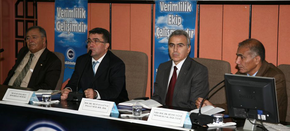 Üniversitemizle verimlilik kültürünün bilinçlendirilmesine yönelik çalışmalar yaptıklarını ifade eden Milli Prodüktivite Merkezi Güneydoğu Anadolu Bölge Müdürü Mustafa Balaban, “Hayatımızın her alanında kullandığımız yerler yapılardır. 1950’li yıllarda özellikle sanayi yapısında ki değişiklikler Türkiye’ye iki farklı unsur verdi. Bunlar sosyal değişiklik ve bu sosyal değişikliğe bağlı olarak insanların ihtiyaçlarını giderecekleri konutlar oldu. İnsanların gelir gruplarına göre çeşitli yapı tarzları, nüfusun şehre göçü ile birlikte yoğunlaştı. 80’li yıllardan sonra ise çarpık yapılaşma arttı. Verimlilik özellikle kaliteli bir yaşamı hak eden insanın hayatının daha yaşanılabilir olması için elinde bulunan imkânları azami derecede kullanabilmesidir” şeklinde konuştu.