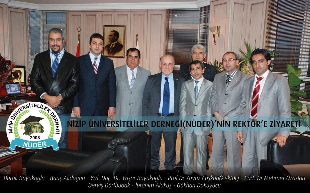 Nizip Üniversiteliler Derneği Yönetim Kurulu Başkanı Derviş Dörtbudak, Başkan Yardımcısı İbrahim Alakuş, Gaziantep Üniversitesi Rektör Danışmanı Prof. Dr. Mehmet Özaslan, Nizip Meslek Yüksekokulu Müdürü Yrd. Doç. Dr. Yaşar Büyükoğlu, Öğretim Görevlisi Burak Büyükoğlu, Öğretim Görevlisi Gökhan Dokuyucu, Nizip Park Bahçeler Müdürü Barış Akdoğan Gaziantep Üniversitesi Rektörü Prof. Dr. Yavuz Coşkun’u makamında ziyaret ettiler.