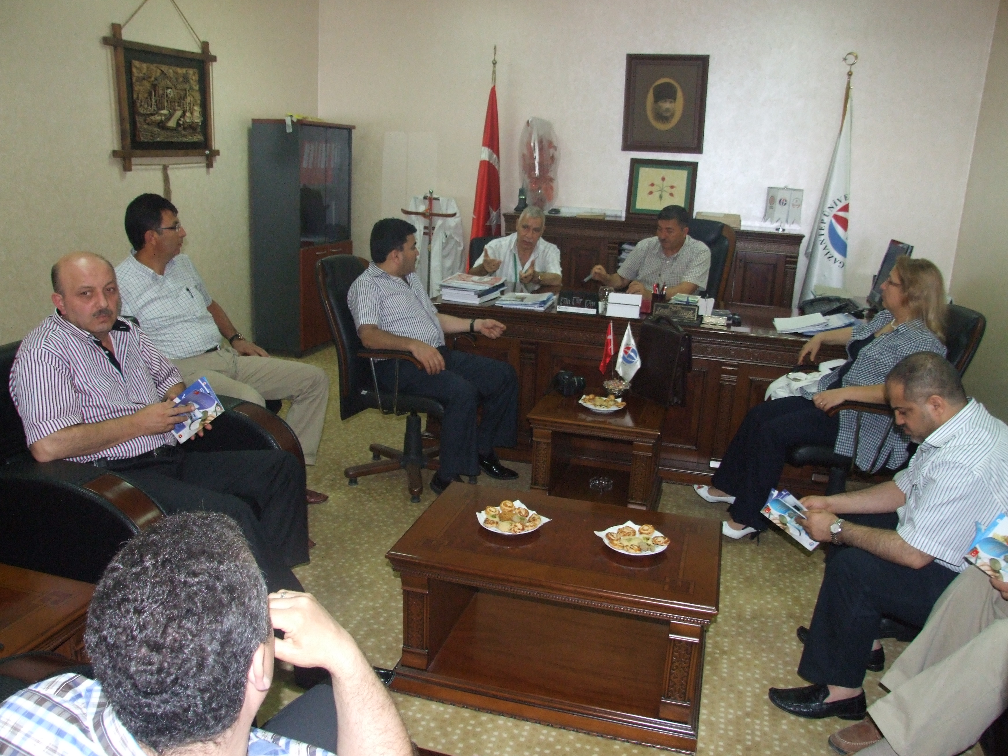 Halep İl Sağlık Müdürlüğüne bağlı çeşitli hastanelerde görev yapan farklı branşlardaki doktorlar, Hastane Başhekim Vekili Prof.Dr. Metin Karakök’ü başhekimlik makamında ziyaret ettiler. Ziyaret esnasında heyet; tıp fakültesinin eğitim sistemi, uzmanlık süreci, hastanede çalışan doktor ve personel sayıları, yabancı uyruklu öğrencilerin tıp alanında eğitim ve barınma durumları, yakın zamanda hastanede başarıyla gerçekleştirilen ilk kalp nakli hakkında bilgi aldılar.