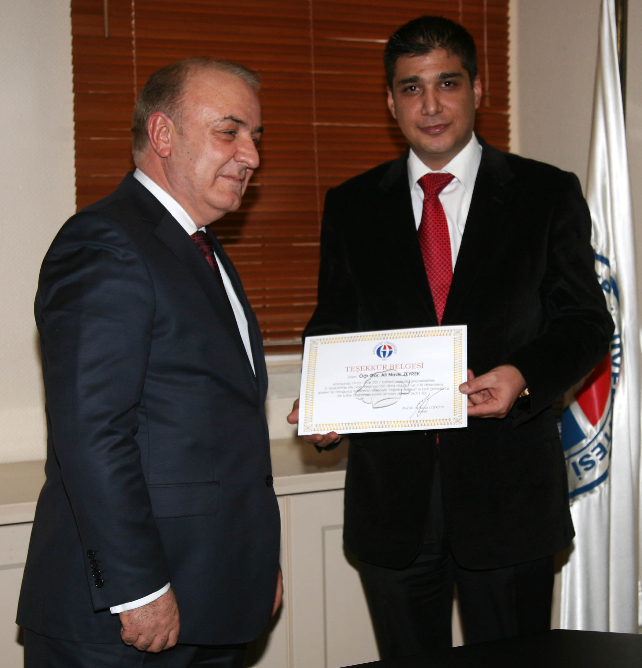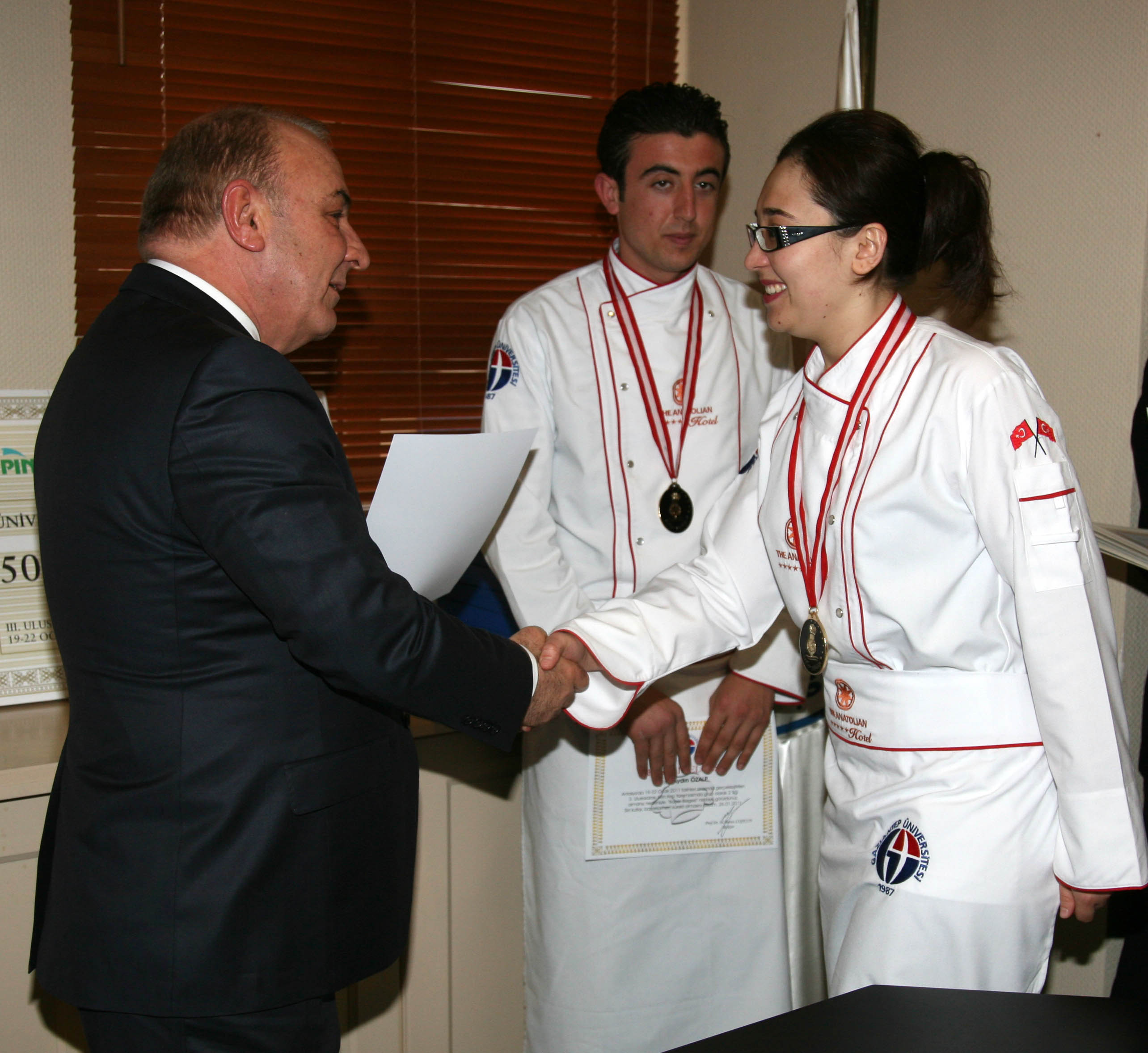Gaziantep Üniversitesi Rektörü Prof. Dr. M. Yavuz Coşkun, Rektör Yardımcısı Prof. Dr. Mehmet Koruk ve Genel Sekreter Ercan Eroğlu tarafından, Gaziantep Üniversitesi Güzel Sanatlar Fakültesi Gastronomi ve Mutfak Sanatları Bölümü Öğretim Üyesi Yrd. Doç. Dr. İlkay Gök Pınarlı’ya, Aşçılık Programı Öğr. Gör. Ali Nadir Zeyrek’e, Anatolian Otel Genel Müdür Yardımcısı Esra Şahin’e, Yönetim Kurulu Başkanı Adına Erim Kısacık’a, Yiyecek – İçecek Müdürü Serdar Geyyaz’a, Şef Sercan Sağlık’a, öğrencilerimiz Musa Bülüç, Hülya Çevik ve Aydın Özalp’e başarılarından dolayı teşekkür belgesi takdim etti.
