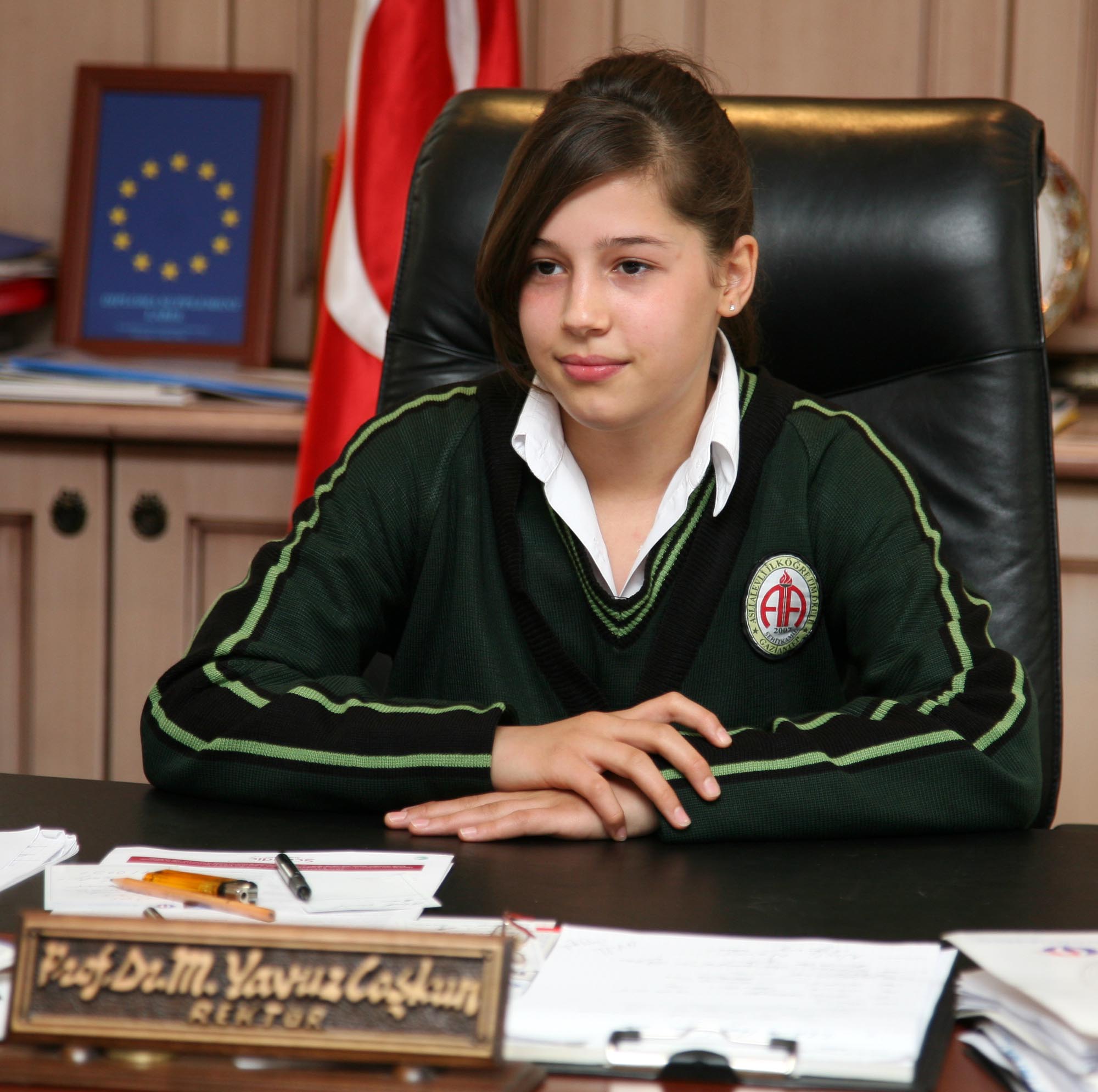 Rektör Prof. Dr. M. Yavuz Coşkun’un makamına oturan 8. sınıf öğrencisi Esma Kamburoğlu, ülkemizde 11 bayan rektörün görev yaptığını belirterek, gelecekte daha fazla bayan rektörün üniversite yönetiminde görev alması gerektiğini söyledi.