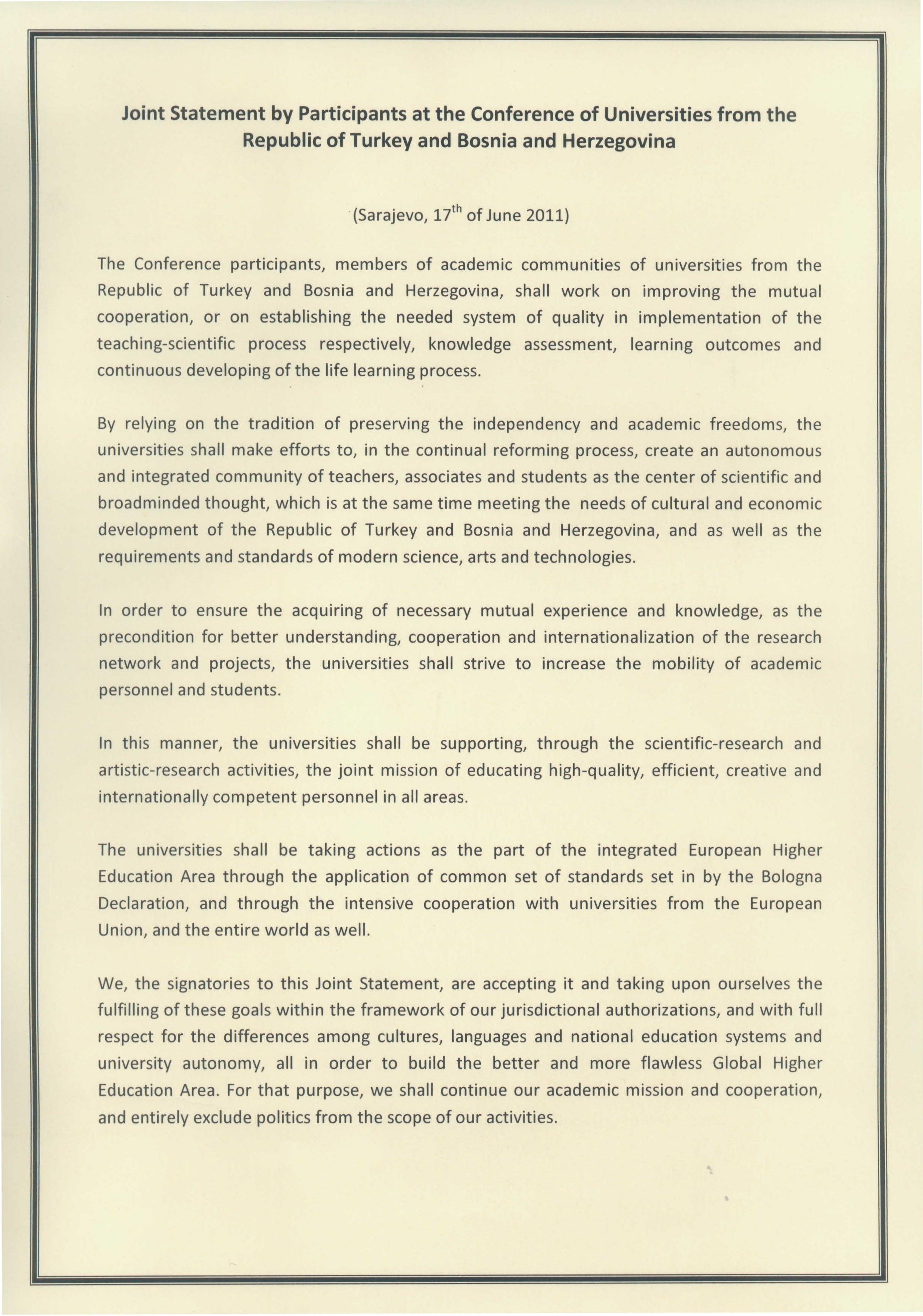 Joint Statement by Participants at the Conference of Universities from the Republic of Turkey and Bosnia and Herzegoniva