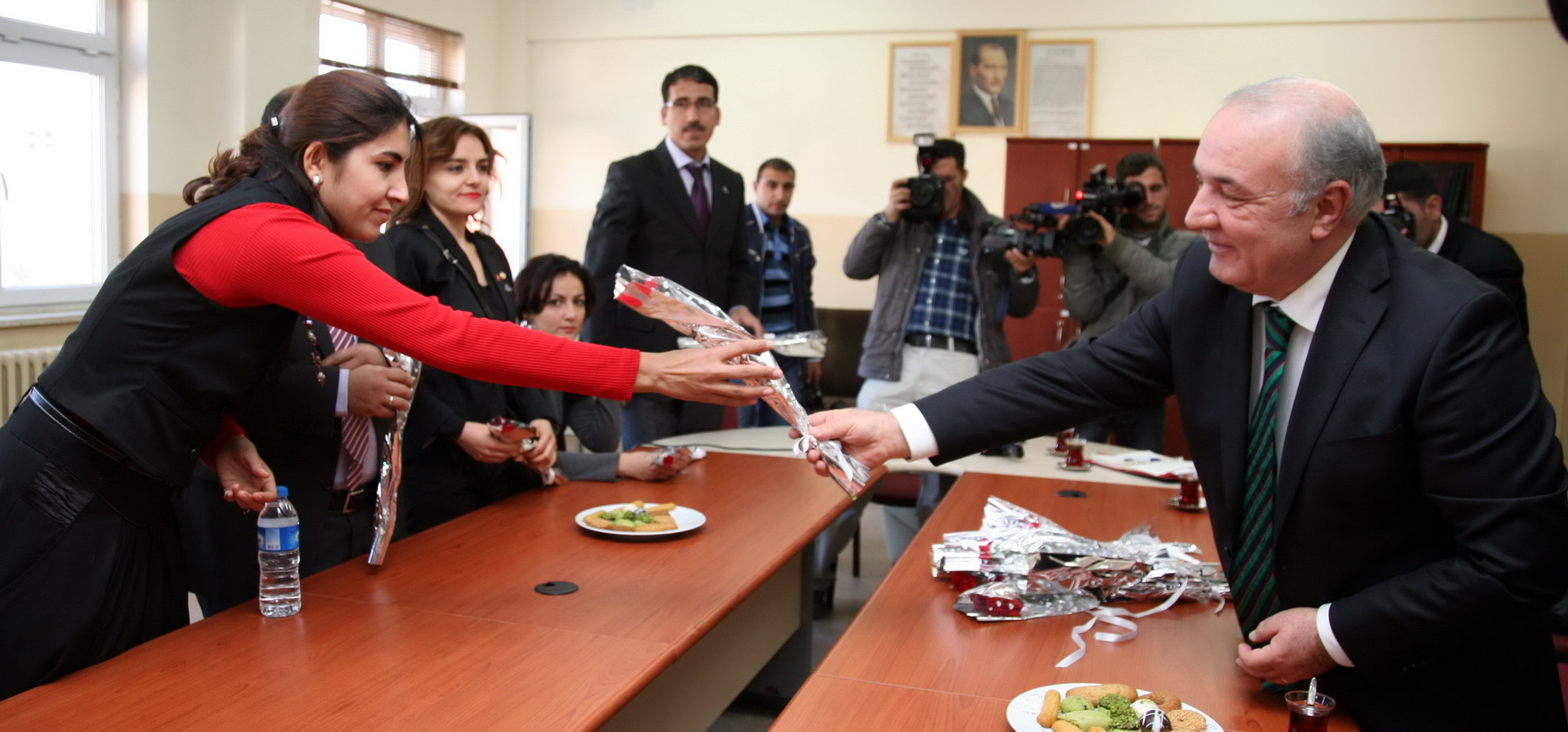 Rektör Coşkun daha sonra okulda görev yapan öğretmenlere karanfil dağıtarak, öğrencilerle  konferans salonunda bir araya geldi.