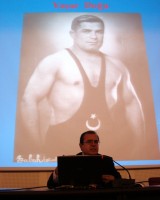 Konferansı veren Prof. Dr. Özbay Güven Türkiye’de Beden Eğitimi ve Spor Tarihçiliğinin ve yayınlarının genel bir panoramasını anlattıktan sonra Türk spor tarihçiliğinin yöntem, kaynak ve belgeler, çalışma konuları ile Türk spor tarihinin, spor ve sporcu şahsiyetler açısından değişik boyutlarına değindi. Dünya spor tarihinde önemli bir yere sahip olan Türk spor tarihçimiz, Mehmet Atıf Kahraman’ın hayatı ve eserlerini toplu bir bakışla sunarken, kendisi ve salonda bulunan dinleyici kitlesinin duygusal anlar yaşadığı görüldü.