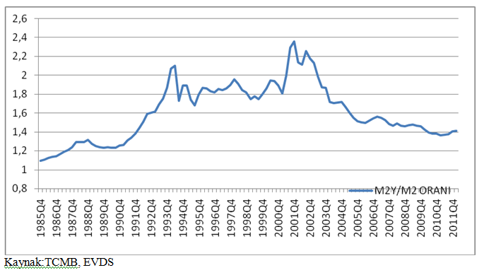 Yrd. Doç. Dr. Şahbaz, “Grafikte döviz tevdiat hesaplarının vadeli mevduatlar içerisindeki payını gösteren M2Y/M2 para arzı oranı yer almaktadır. Bu oran esas itibari ile dolarizasyonu ifade etmektedir. Yani ulusal paranın dolar, Euro gibi yabancı paralarla olan ikamesini göstermektedir. Başka bir ifade ile kriz dönemlerinde ulusal paraya duyulan güven azaldıkça ekonomik ajanlar yabancı paraya doğru yönelmektedir. Şekilde özellikle 1994 yılı ikinci çeyreğinde bu oran hızlı bir şekilde artış göstermiştir. Devalüasyonu takip eden dönemde de hızlıca TL’ye yeniden kısmi yönelme gerçekleşmiştir. 1997-1998 Asya ve Rusya kriz dönemlerinde ve özellikle 2001 şubat krizinin yaşandığı dönemde M2Y/M2 oranı çok yüksek değerlere çıkmıştır” diyerek 2,38 gibi değerlere kadar yükselen rasyo vadeli mevduatların neredeyse 1,38 katı kadar DTH’nın bulunduğunu ifade etti.