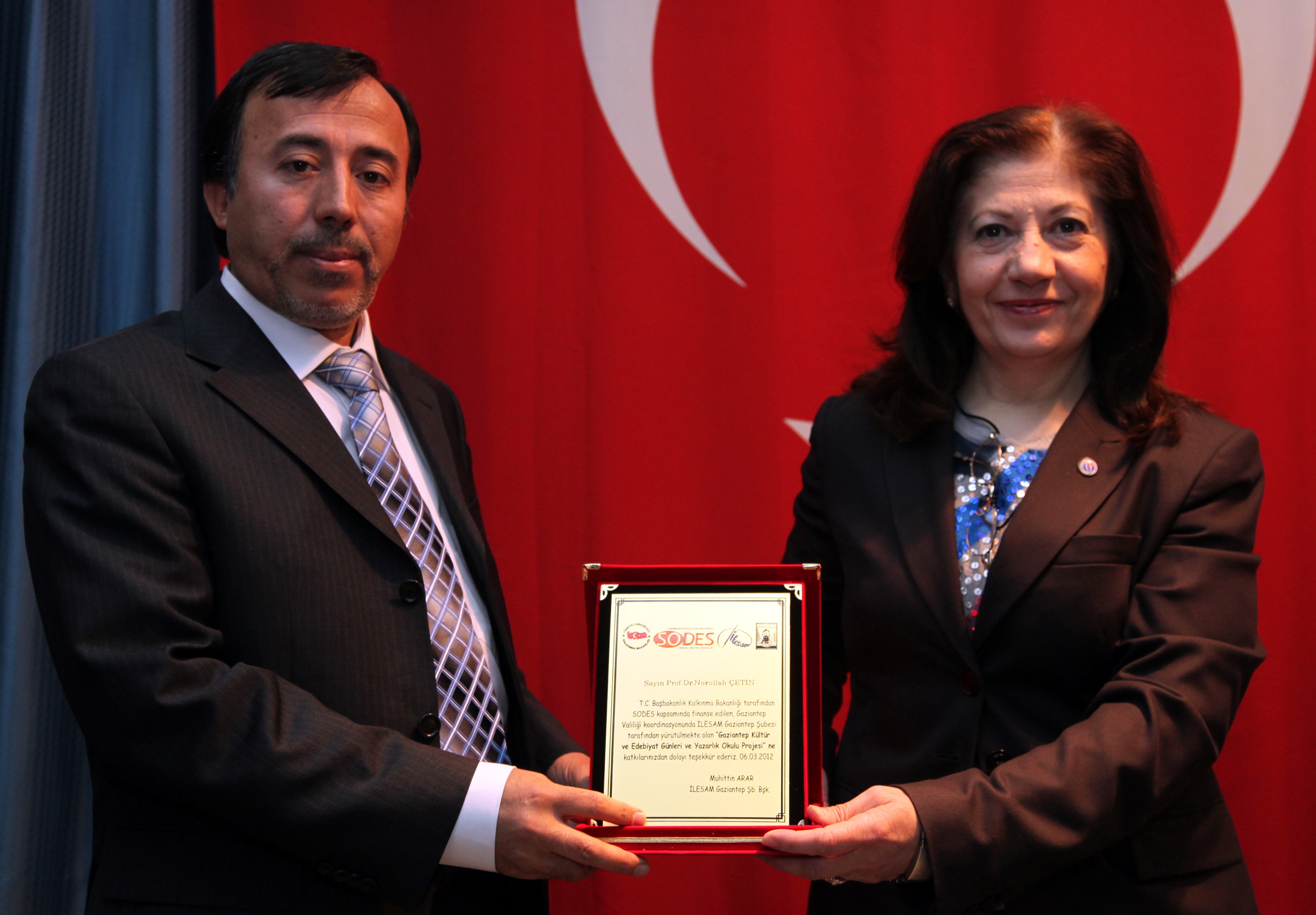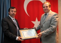Söyleşinin sonunda konuşmacı Prof. Dr. Nurullah Çetin’e, Üniversitemiz Fen – Edebiyat Fakültesi Öğretim Üyesi Yrd. Doç. Dr. Behiye Köksel tarafından plaket, Eğitim Fakültesi Öğretim Üyesi Yrd. Doç. Dr. Arif Yılmaz tarafından ise teşekkür belgesi takdim edildi.