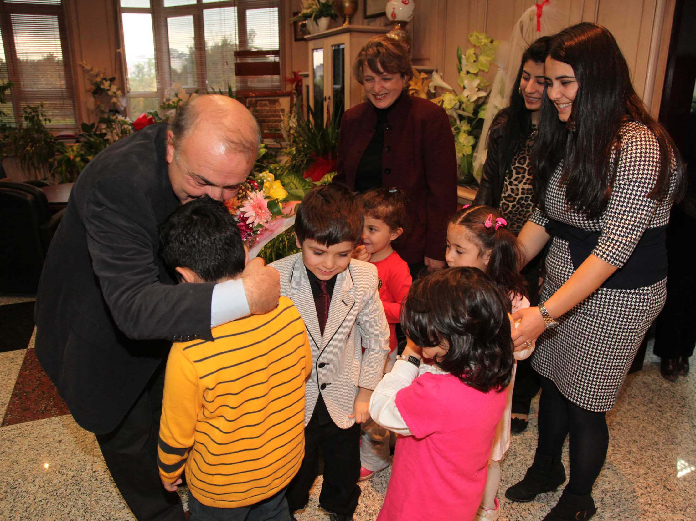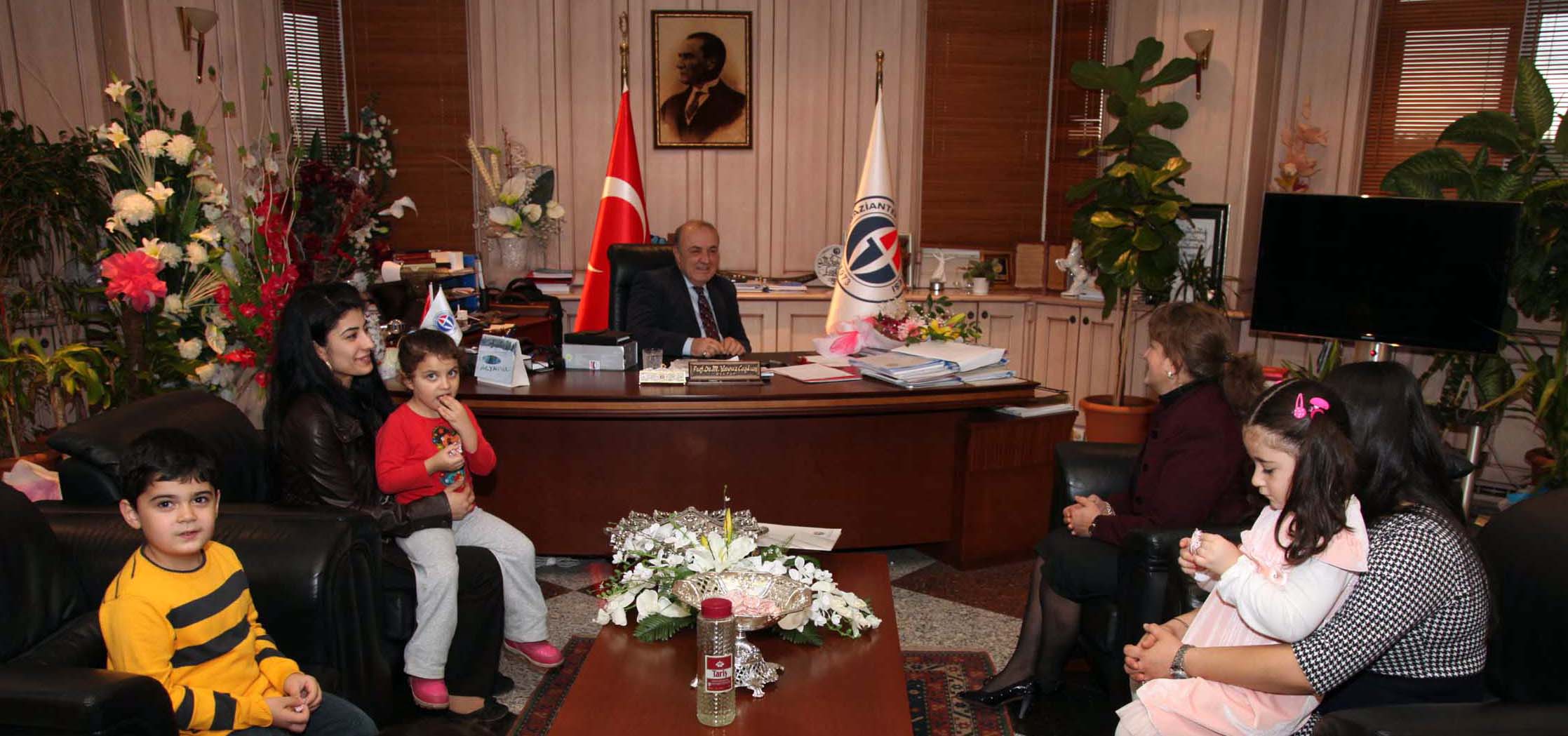 Gaziantep Üniversitesi Kreş ve Anaokulu öğrencileri Meriç Tohumcu, Muhsin Göktuğ Büyükikiz, Fatma Yıldızpolat, Timuçin Uludağ, Zeynep Sude Gündüz ve Kreş ve Anaokulu Müdiresi Güler Boran “24 Kasım Öğretmenler Günü” dolayısıyla Gaziantep Üniversitesi Rektörü Prof. Dr. M. Yavuz Coşkun’u makamında ziyaret ederek, çiçek takdim ettiler.