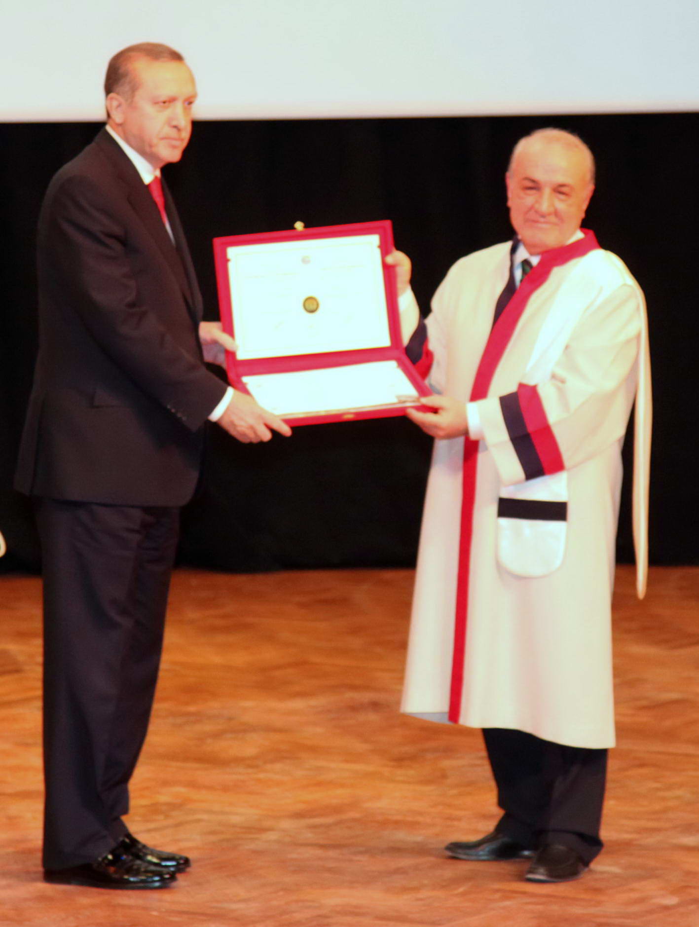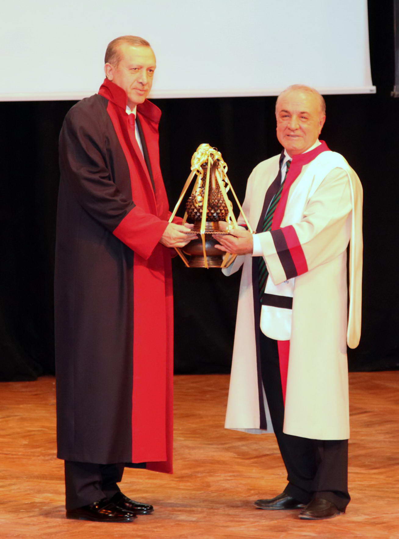 “Bilim ve Teknoloji Yüksek Kurulu’na işlerlik kazandırarak ülkemiz için çağdaş ve etkin “bilim” ve “teknoloji” politikaları oluşturmasına önderlik etmesi; milli gelirin artırılması ve bu milli gelirden Araştırma – Geliştirme çalışmalarına ayrılan payın ‘oransal olarak’ yükseltilmesi hususunda gayret sarf ederek, “katma değerli” ürün ve hizmetler üretmeyi ve bunları ihraç etmeyi önceleyen Araştırma – Geliştirme ve “teknoloji odaklı” stratejiler üretmesi; “inovasyon”, “girişimcilik”, “teknoloji”, “markalaşma”, “üniversite-sanayi işbirliği” vb gibi kavramların öneminin altını, sadece “iş dünyası” için çizmekle yetinmeyip, bunların yaşamın her anında ve alanında fiilen uygulamaya geçirilmesine öncülük etmesi; üniversitelerin yaygınlaştırılması ve geliştirilmesine dair çok ciddi katkı yapması; eğitim, bilim ve teknolojiye dayalı kalkınma politikaları geliştirmesi ve bunların uygulanmasını sağlamış olması nedenleriyle, Türkiye Cumhuriyeti Başbakanı Sayın Recep Tayyip Erdoğan’a “Yönetim ve Organizasyon” alanında Fahri Doktora verilmesine oybirliği ile karar verilmiştir”