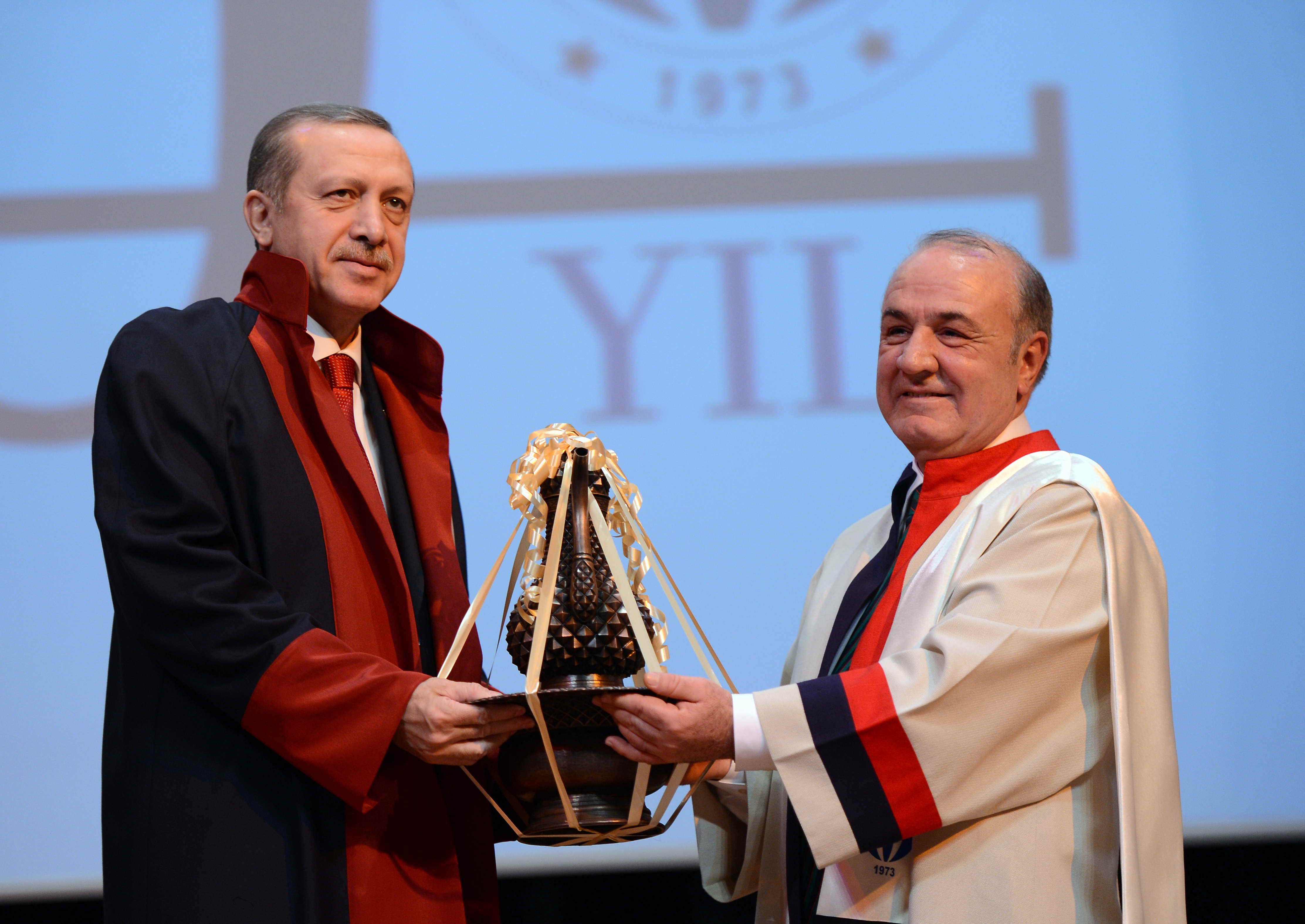 “Bilgiyi raflardan indirmek zorundayız. Sosyal projeler, estetik, sanat, her alanda özellikle sanayi alanında bilgi hayata geçmeli. Teknolojinin farkında olan akademisyenler olarak, bunun farkında olan bir üniversite olarak hareket etmeye çalışıyoruz. Bu yüzden sanayiye, bu yüzden teknolojiye bilgiyi katarak, inovatif ürünler, yeni ürünler ortaya çıkarmak zorundayız. ‘Üniversite – Sanayi İşbirliği’ hep altı doldurulamayan cümleler olarak geçti. Biz artık bunun altını dolduruyoruz. Üniversite – Sanayi İşbirliği dediğiniz zaman arada kırılmayan bir cam duvar vardı. Biz bunu kırdık ve kol kola yürüyoruz. Bu nedenle proje mantığı içerisinde sektörel eğitimler, toplantılar gerçekleştirdik. Mühendislikte ‘intörn modelini’ hayata geçirdik. Sizlerin bize olan destekleriyle biz bu güzel Türkiye’ye en güzel örnekleri sunacağız” diyerek konuşmasını tamamlayan Rektör Prof. Dr. Coşkun daha sonra Başbakan Recep Tayyip Erdoğan’a “fahri doktora” ünvanı verilmesine ilişkin “senato kararını”* okudu. Prof. Dr. Coşkun daha sonra Başbakan Erdoğan’a fahri doktora ünvanını takdim etti.