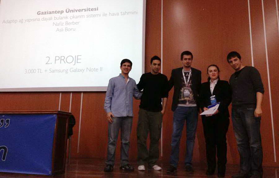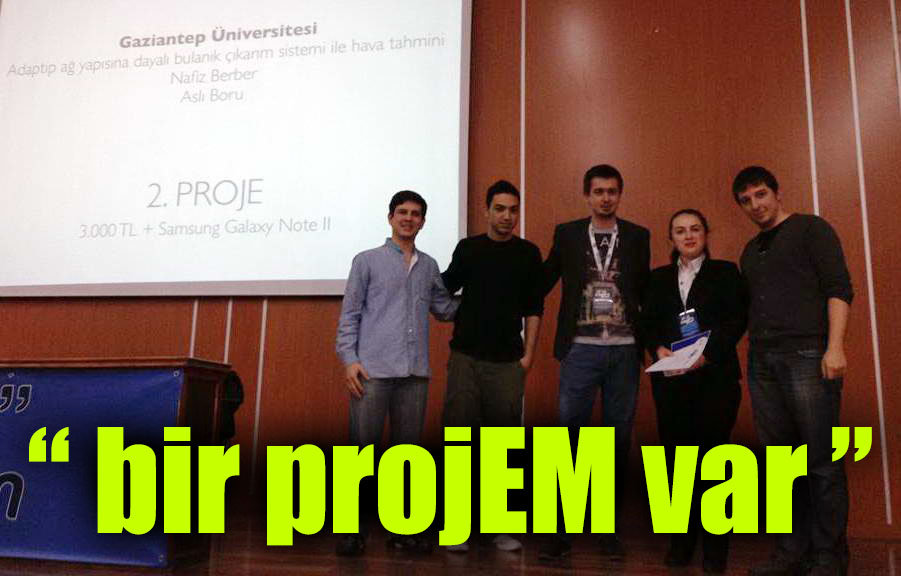 Gaziantep Üniversitesi (GAÜN) Kültür Müdürlüğü’ne bağlı olarak faaliyetlerini sürdüren ‘Yenilikçilik Topluluğu’ üye öğrencilerinden Aslı Boru ve Nafiz Berber, İstanbul Teknik Üniversitesi (İTÜ) tarafından her yıl düzenlenen Endüstri Mühendisleri Öğrenci Sempozyumu (EMÖS) kapsamında yapılan “Bir ProjEM Var Diyorsan” adlı proje yarışmasında “Adaptif Ağ Yapısına Dayalı Bulanık Çıkarım Sistemi İle Hava Tahmini” adlı çalışma ile ‘3000 TL ve bir akıllı cep telefonundan’ oluşan “ikincilik ödülünü” kazandı.