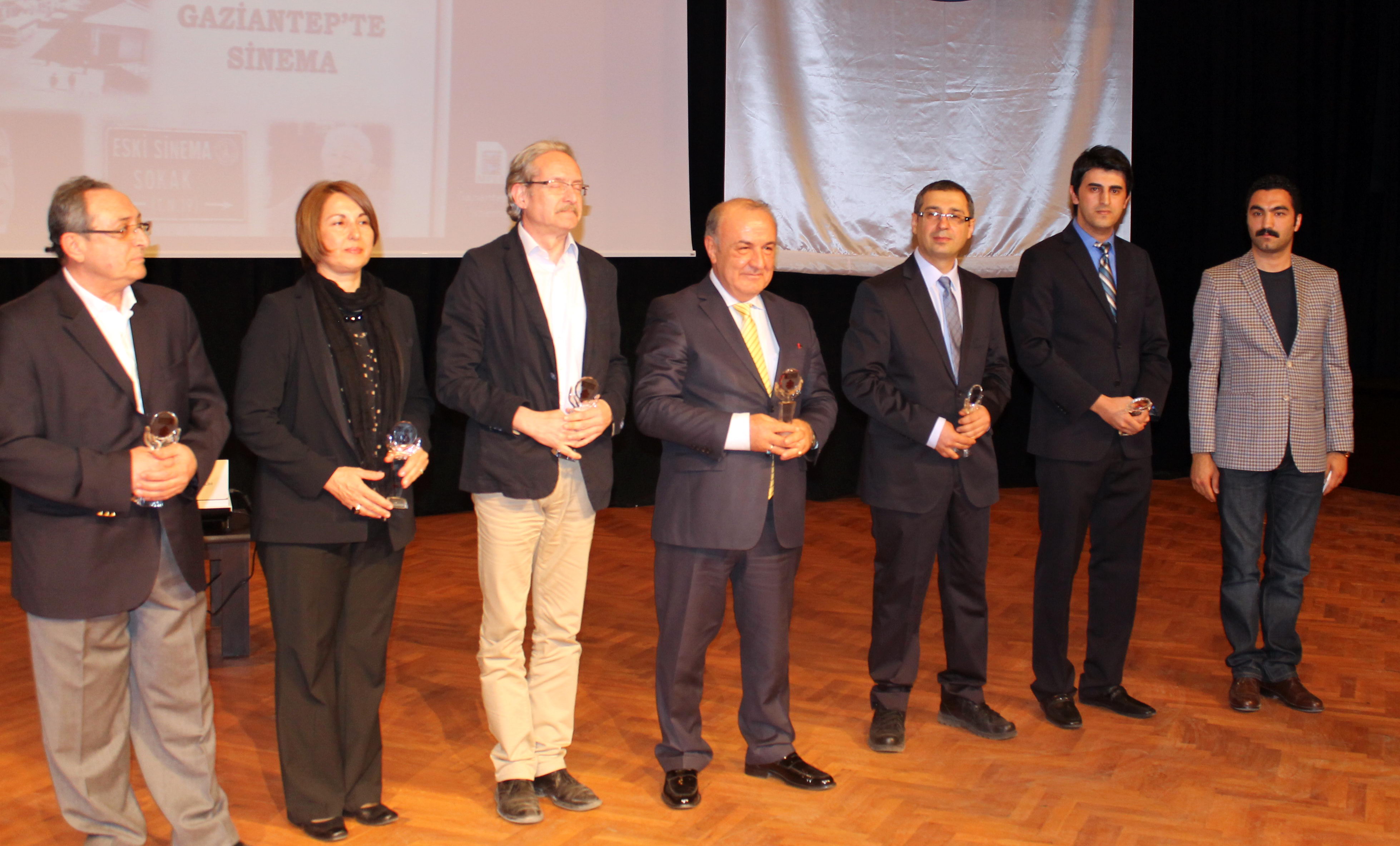 Gaziantep’te sinema olgusunun geçmişini dönemin tanıkları aracılığıyla ele alan filmin gösteriminin ardından filmde yer alan konuşmacılara plaket verildi.