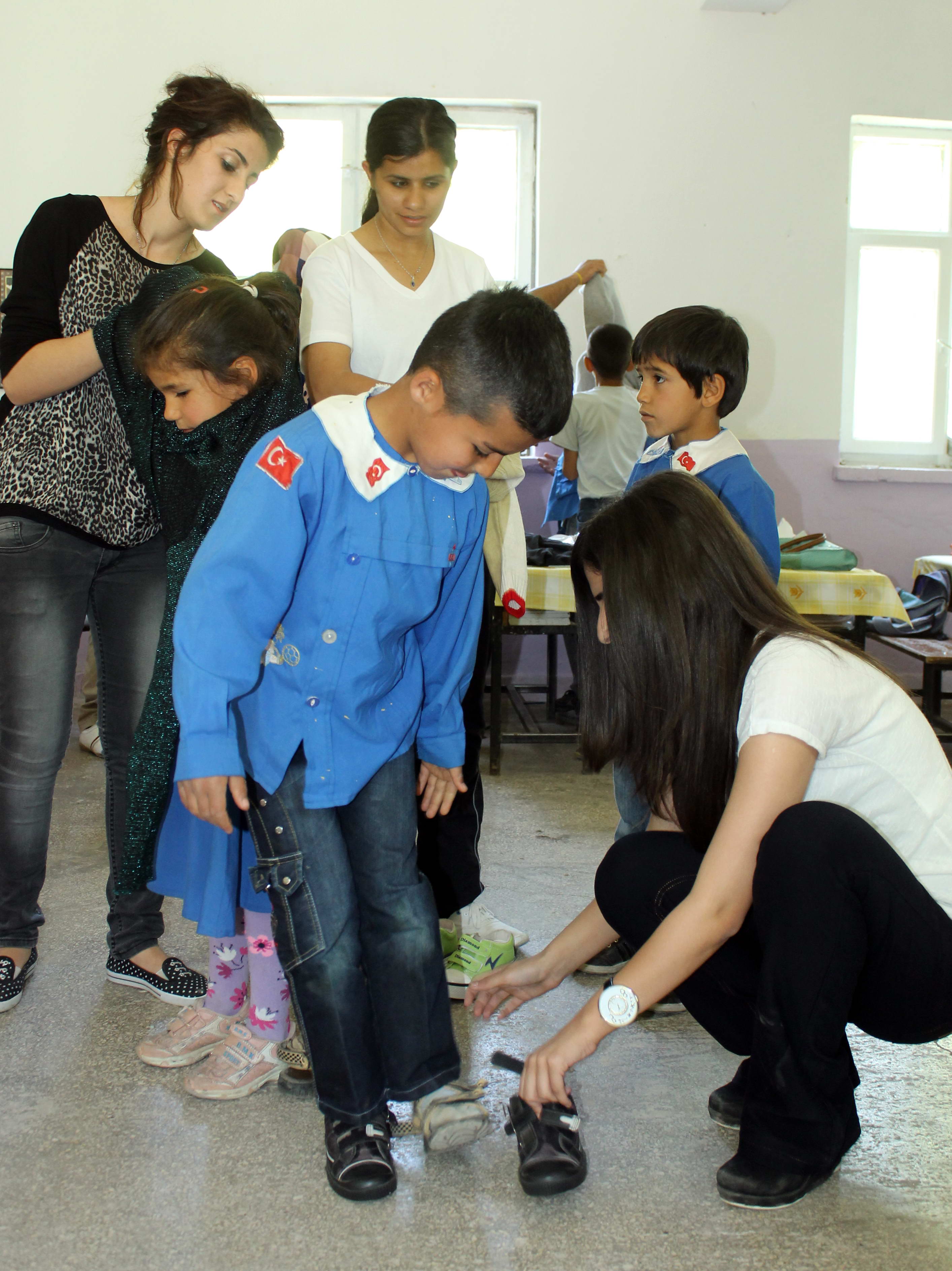 Ayakkabıları öğrencilere giydiren üniversiteliler, elbiseleri de ihtiyaç sahiplerine dağıttılar.