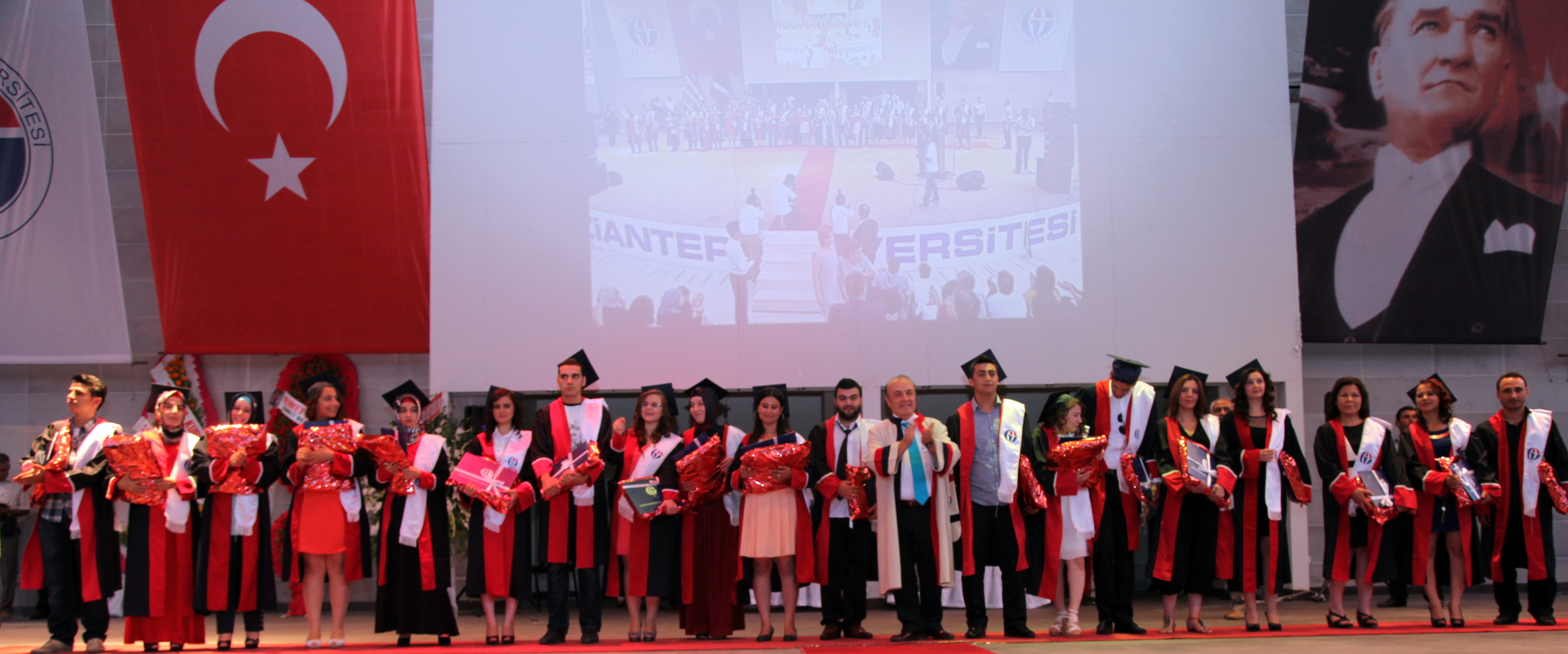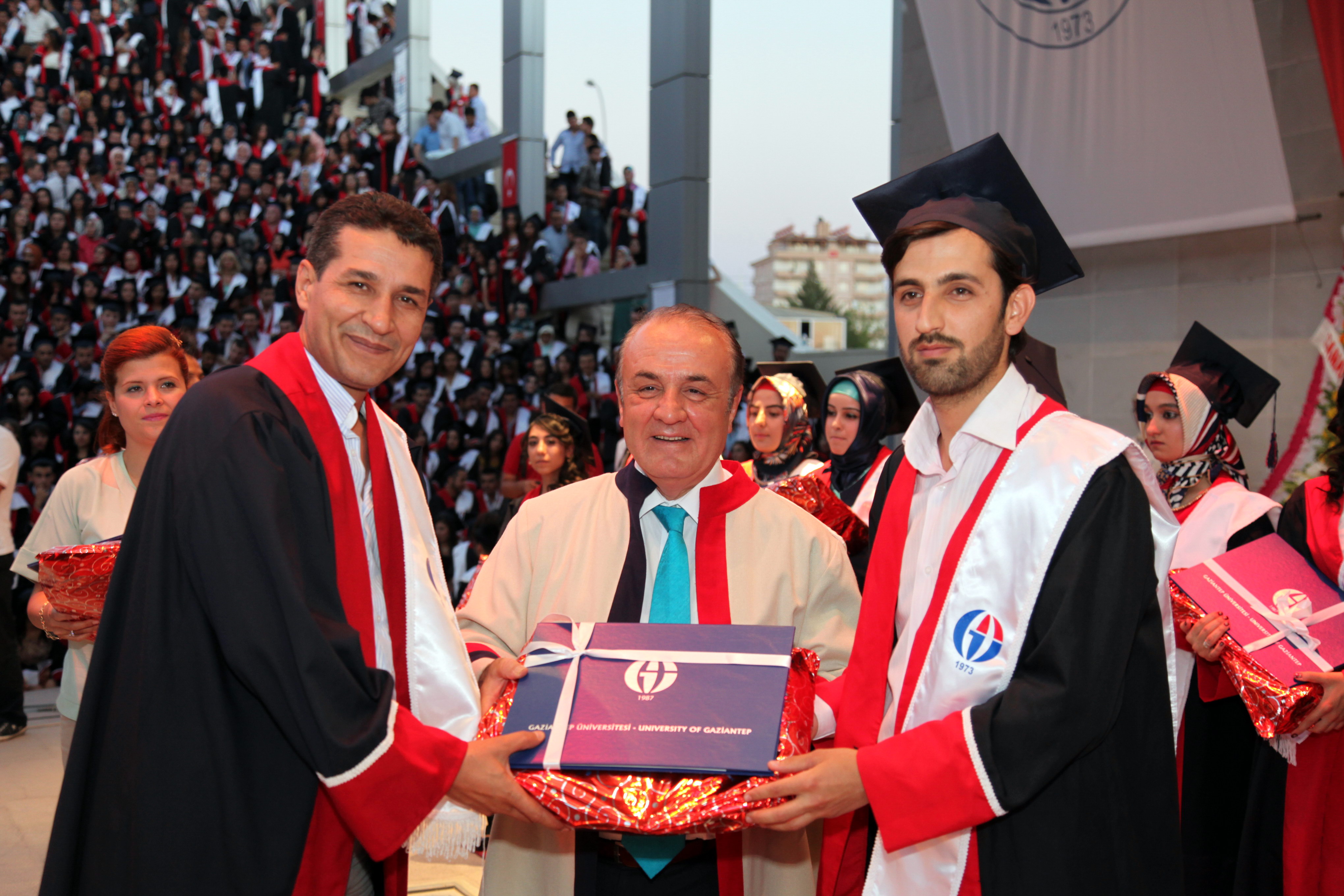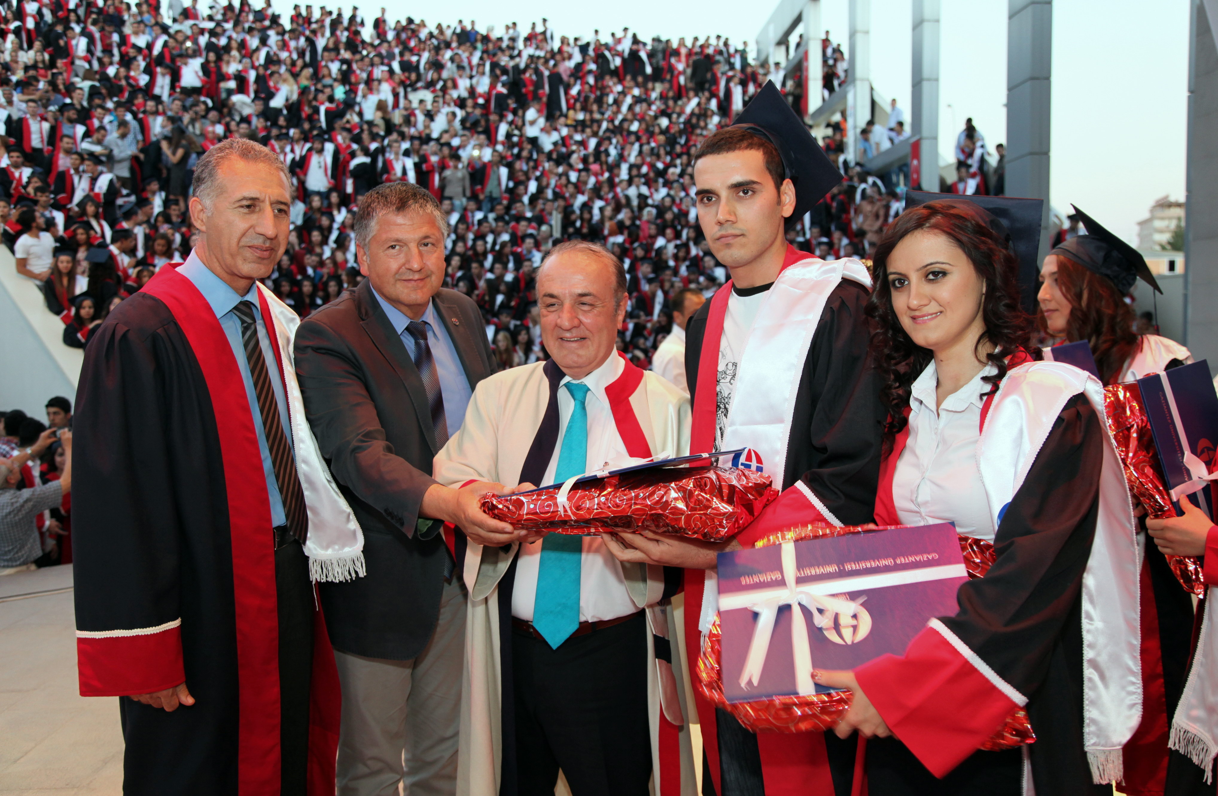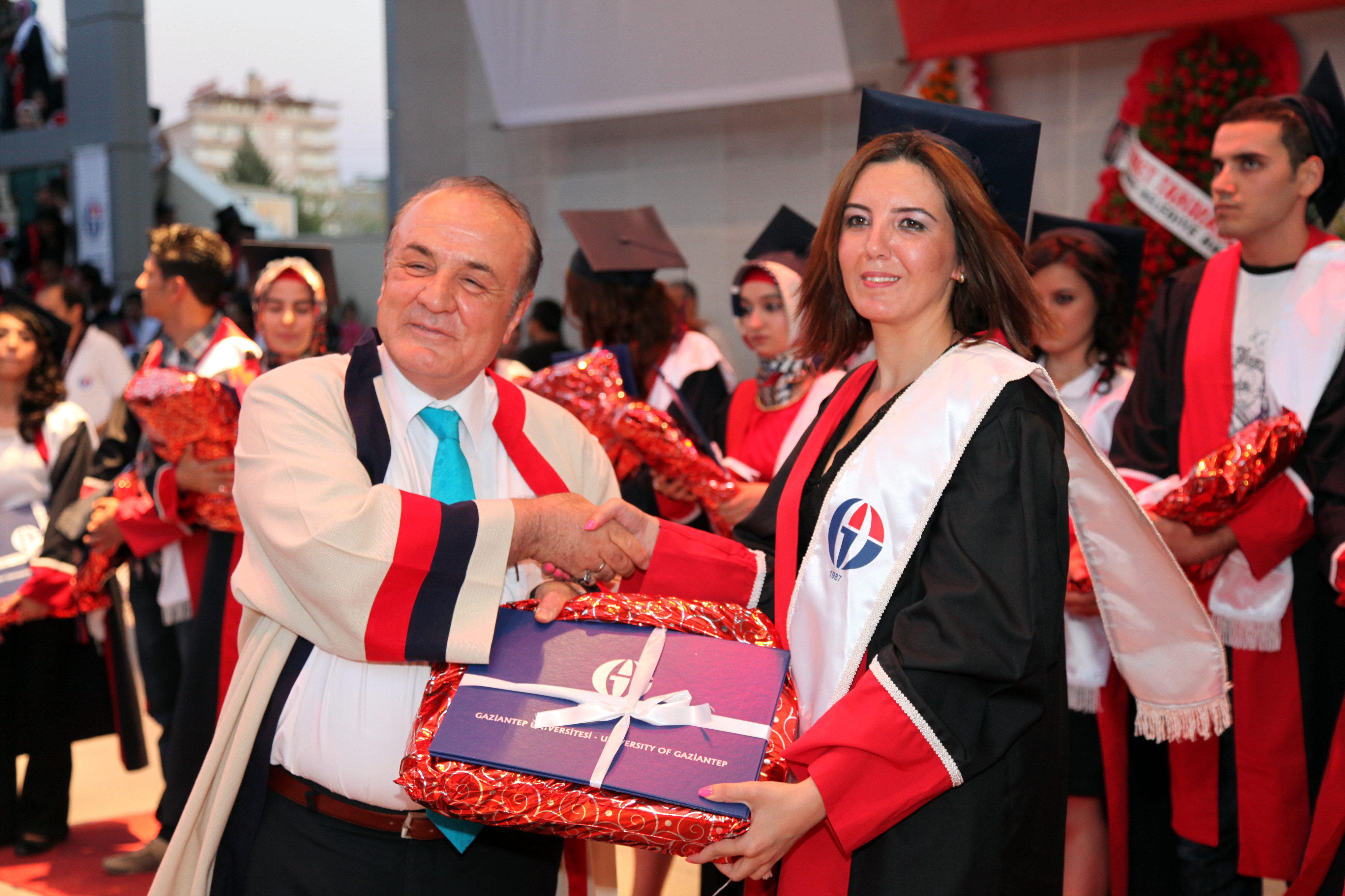 Amfi Tiyatro’da düzenlenen mezuniyet törenine, Gaziantep Meslek Yüksek Okulu, Sağlık Hizmetleri Meslek Yüksekokulu, Turizm Otelcilik Meslek Yüksekokulu, Naci Topçuoğlu Meslek Yüksekokulu, Oğuzeli Meslek Yüksekokulu, İslahiye Meslek Yüksekokulu, Nurdağı Meslek Yüksekokulu ile Araban Meslek Yüksekokulu’ndan mezun olan 2 bin 400 öğrenci, öğrencilerin aileleri, öğretim üyeleri katıldı. Amfi tiyatroyu dolduran öğrenci ve yakınlarının büyük bir heyecan yaşadıkları mezuniyet töreninde öğrenciler toplu olarak Gaziantep Üniversitesi Marşı’nı okuyup, kep fırlattı.