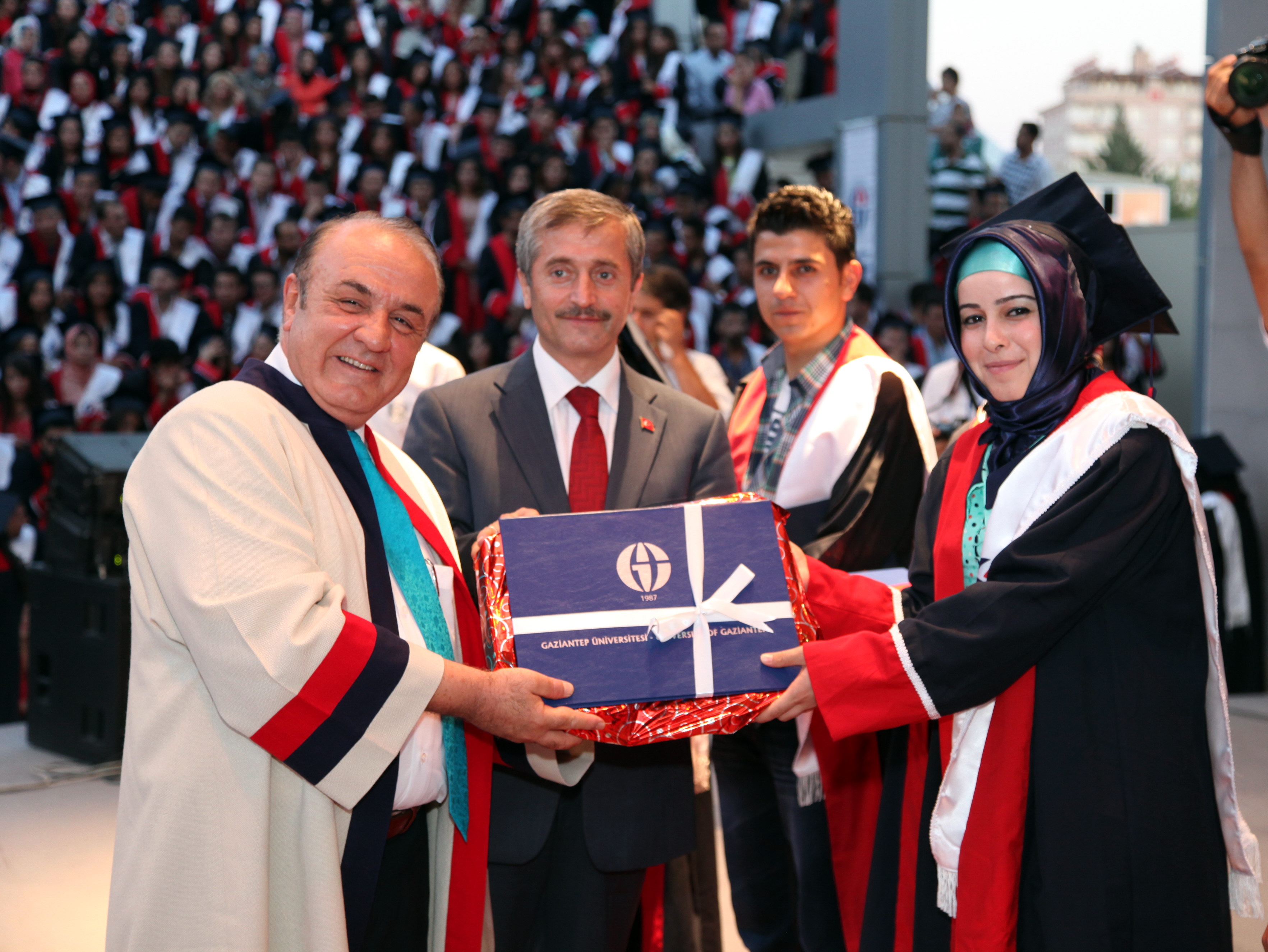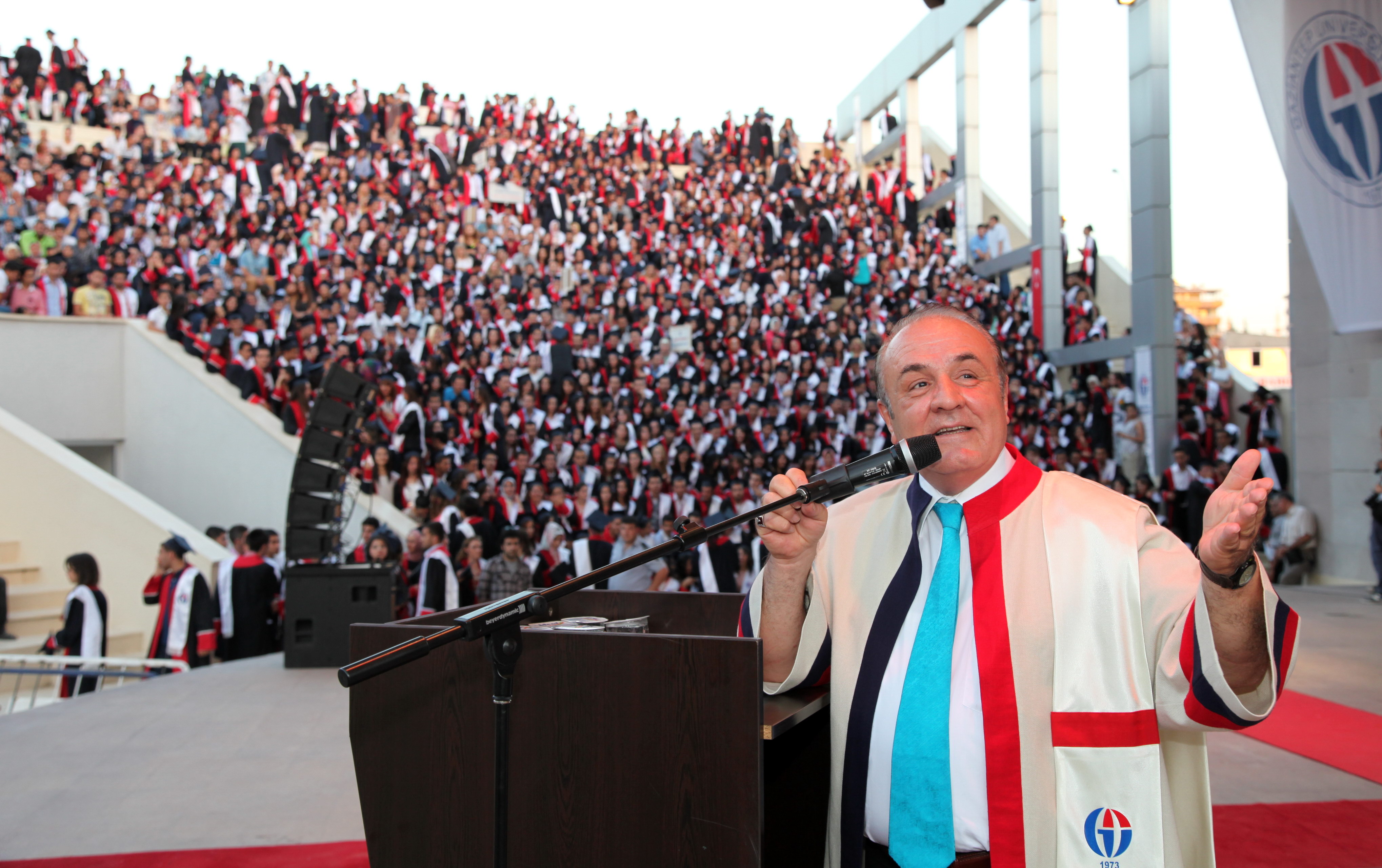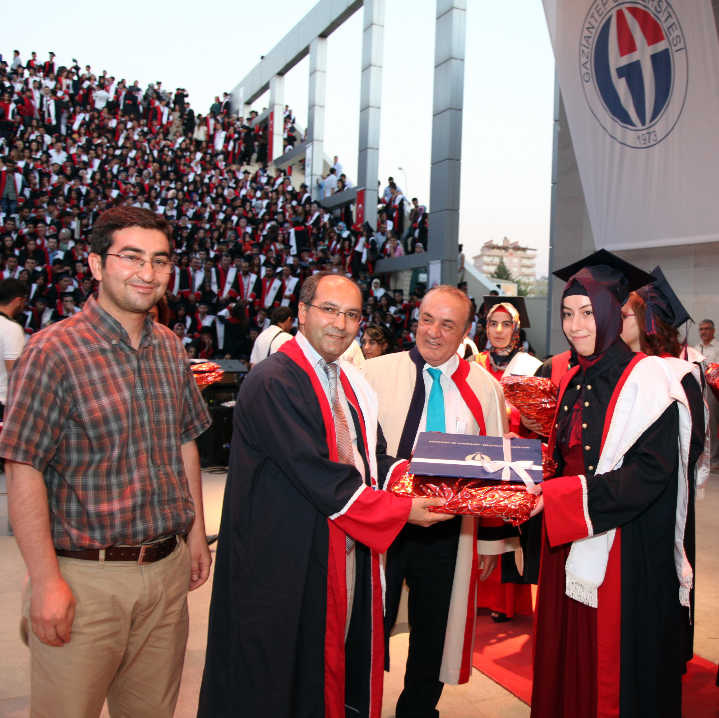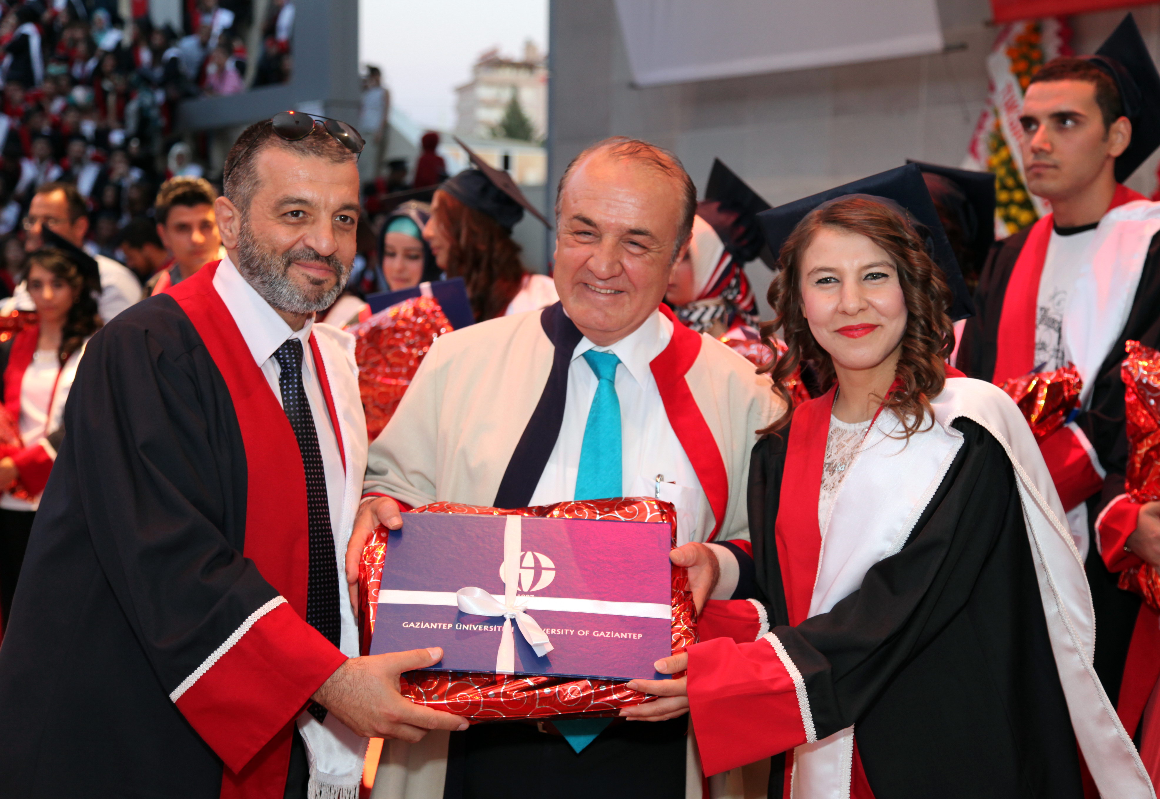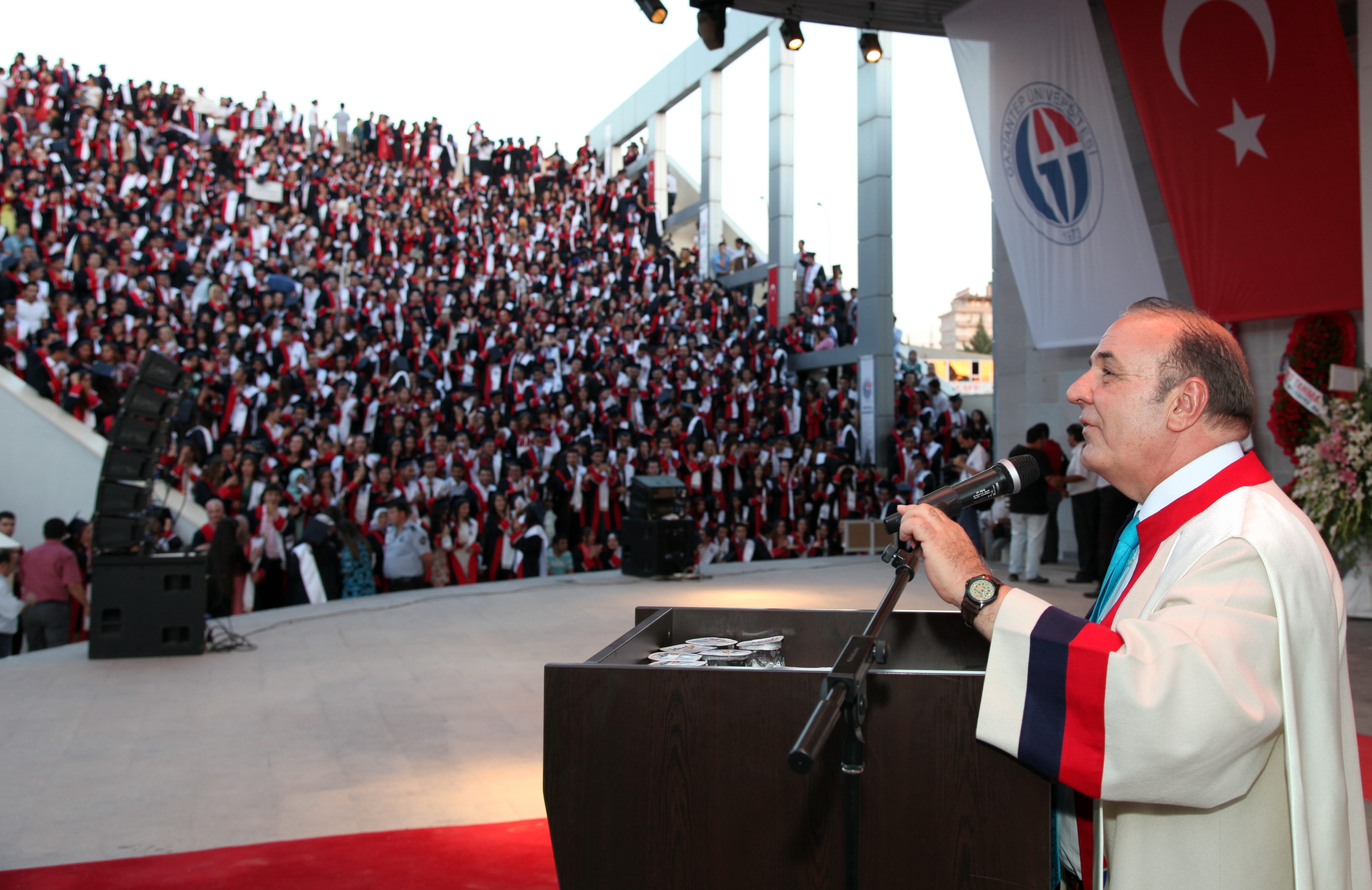 Amfi Tiyatro’da düzenlenen mezuniyet törenine, Gaziantep Meslek Yüksek Okulu, Sağlık Hizmetleri Meslek Yüksekokulu, Turizm Otelcilik Meslek Yüksekokulu, Naci Topçuoğlu Meslek Yüksekokulu, Oğuzeli Meslek Yüksekokulu, İslahiye Meslek Yüksekokulu, Nurdağı Meslek Yüksekokulu ile Araban Meslek Yüksekokulu’ndan mezun olan 2 bin 400 öğrenci, öğrencilerin aileleri, öğretim üyeleri katıldı. Amfi tiyatroyu dolduran öğrenci ve yakınlarının büyük bir heyecan yaşadıkları mezuniyet töreninde öğrenciler toplu olarak Gaziantep Üniversitesi Marşı’nı okuyup, kep fırlattı.