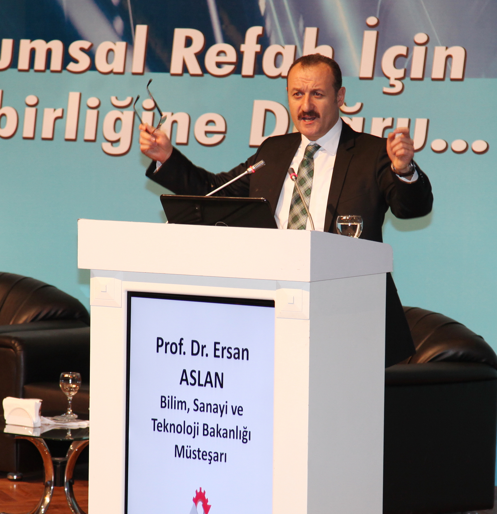 Bilim Sanayi ve Teknoloji Bakanlığı’nın Gaziantep Üniversitesi’nin ev sahipliğinde düzenlenen Kamu – Üniversite – Sanayi İşbirliği Toplantısı’nda konuşan Bakanlık Müsteşarı Prof. Dr. Ersan Aslan, “Ürüne yönelik yapacağımız çalışmaları, orta üstü ve yüksek teknolojiye yönelik yoğunlaştırırsak, 2023’teki 500 milyar dolar ihracat hedefine ulaşmamamızın hiçbir nedeni, hiçbir gerekçesi yok” dedi. Aslan, üniversitelerin bu hedefe ulamada önemli rol oynayacağını belirterek, “Gaziantep Üniversitesi’nin bu anlamda bir model olacağı düşünüyorum” diye konuştu.