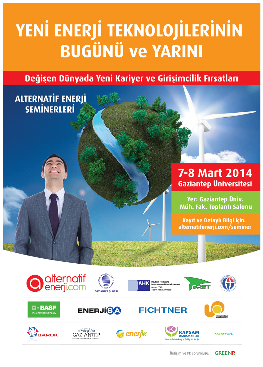 Temiz enerjiyle ilgili çalışmaları konusunda tanınan Alternatif Enerji ile Alman-Türk Ticaret ve Sanayi Odası işbirliğinde ‘Yeni Enerji Teknolojilerinin Bugünü ve Yarını’ konulu 7–8 Mart günleri Gaziantep Üniversitesi’nde gerçekleştirilecek. Gaziantep Üniversitesi (GAÜN) Mühendislik Fakültesi Dekanlık Binası’ndaki seminerin Cuma günkü programı 09.00’da başlayacak. Cumartesi günkü programın başlama saati ise 10.00. Türkiye'nin 5 farklı şehrinde üniversite öğrencileri ile yenilenebilir enerji sektörü temsilcilerini bir…
