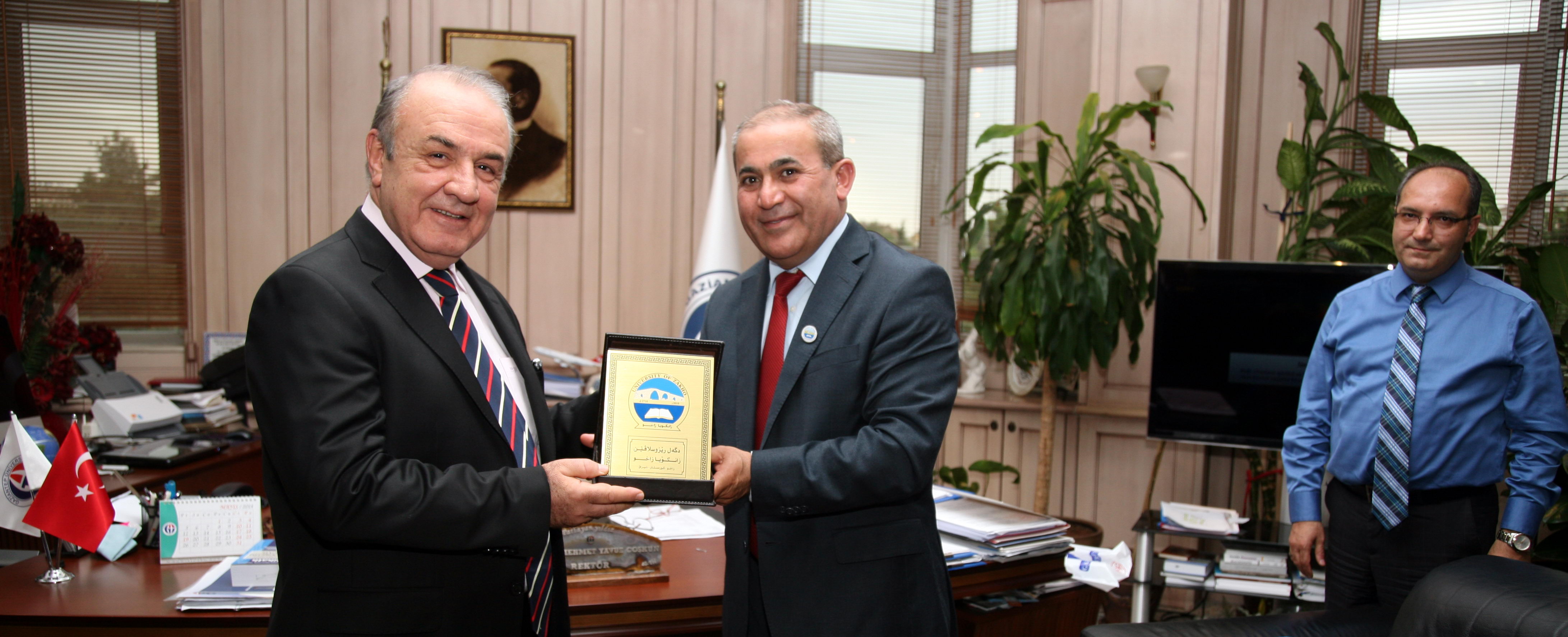 Konuşmaların ardından Zaho Üniversitesi Rektör Yardımcısı Prof. Dr. Halit, GAÜN Rektörü Prof. Dr. Yavuz Coşkun ve Rektör Yardımcısı Prof. Dr. Ali Gür’e plaket ile üniversitelerinin tanıtım broşürleri sundu. Rektör Coşkun da Halit’e sedef kakmalı sandık hediye etti.