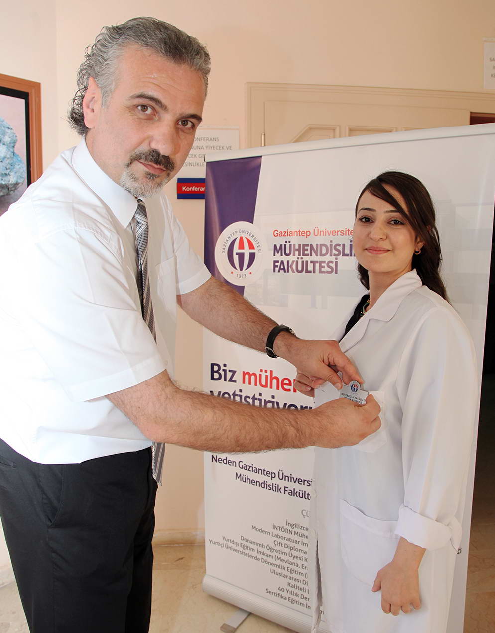 2014-2015 Eğitim Yılı’nda intörn mühendis olarak sahaya çıkacak olan öğrencilere hitap eden GAÜN Mühendislik Fakültesi Dekanı ve İntörn Takip Kurulu Başkanı (İTAK) Prof. Dr. Mustafa Bayram, intörn uygulamasının faydalarını anlattı. Öğrencilerden, intörn olarak bulunacakları kurumlarda birer mühendis ve GAÜN öğrenciliğine layık tutum ve davranışlar içinde bulunmaları uyarısında bulunan Bayram, “Sizlerden ilk isteğimiz iş kazaları konusunda dikkatli olmanız. Sahaya sapasağlam çıkıyorsunuz, inşallah öyle de döneceksiniz. Onun için, iş güvenliği kurallarına mutlaka uyun. İntörnlük uygulamasından başarılı olup olmayacağınızı, uygulama için gideceğiniz işyerlerinde saygılı davranırsanız, aynı saygıyı görürsünüz” diye konuştu.