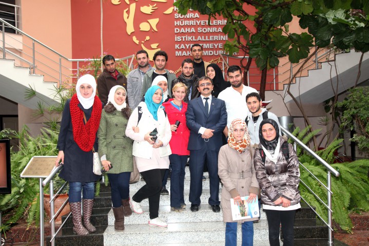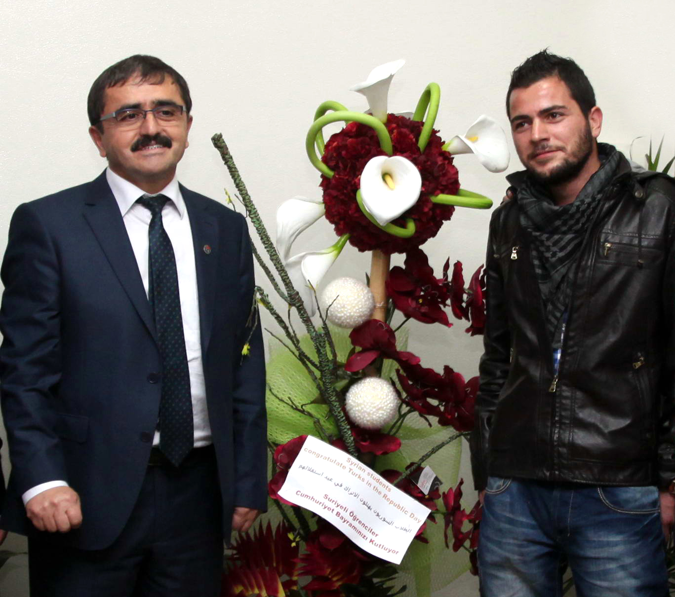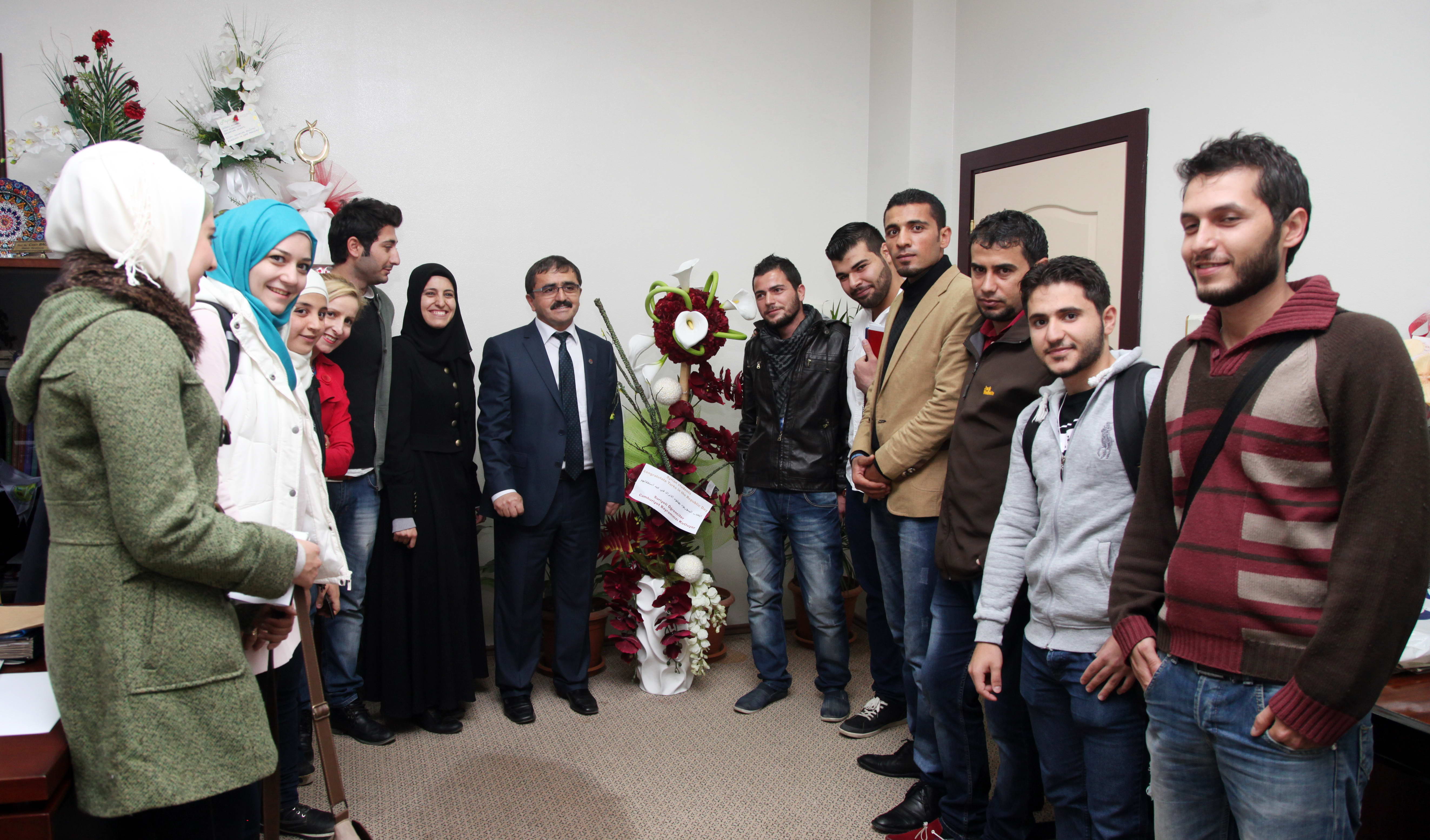 Gaziantep Üniversitesinde öğrenimlerini sürdüren Suriyeli öğrenciler, Rektör Yardımcısı Prof. Dr. Cahit Bağcı’ya üstünde Türçe, İngilizce ve Arapça ‘Cumhuriyet Bayramınız Kutlu Olsun’ yazılı çiçek sundu. Rektör Yardımcısı Bağcı da öğrencilere, “İnşaallah Suriye’de de yakında barış sağlanır ve sizlerde Cumhuriyet Bayramınızı kutlarsınız” dedi.