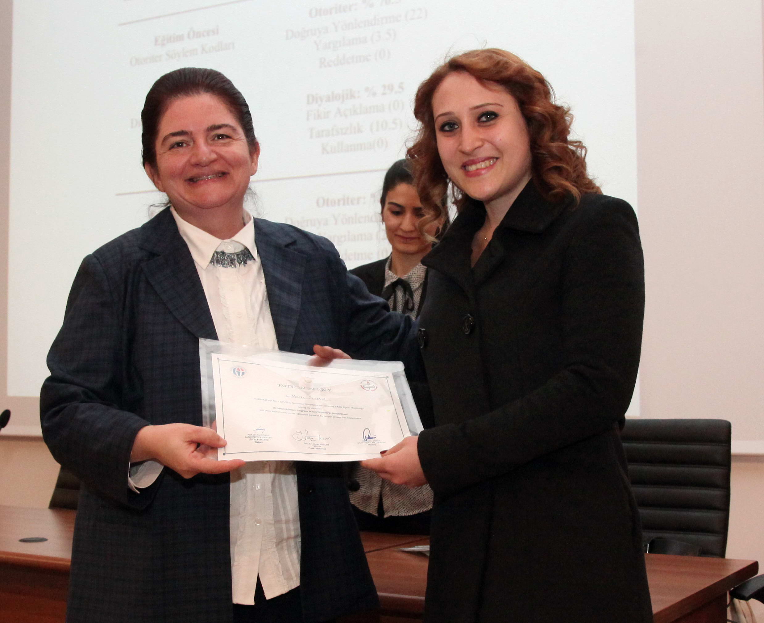 TÜBİTAK tarafından desteklenen diyalojik söylemin geliştirilmesine yönelik düzenlenen “Bir Mesleki Gelişim Programı İle Sınıf Söyleminin Geliştirilmesi” adlı projeye katılan 23 öğretmene sertifika ve hediye takdim edildi.