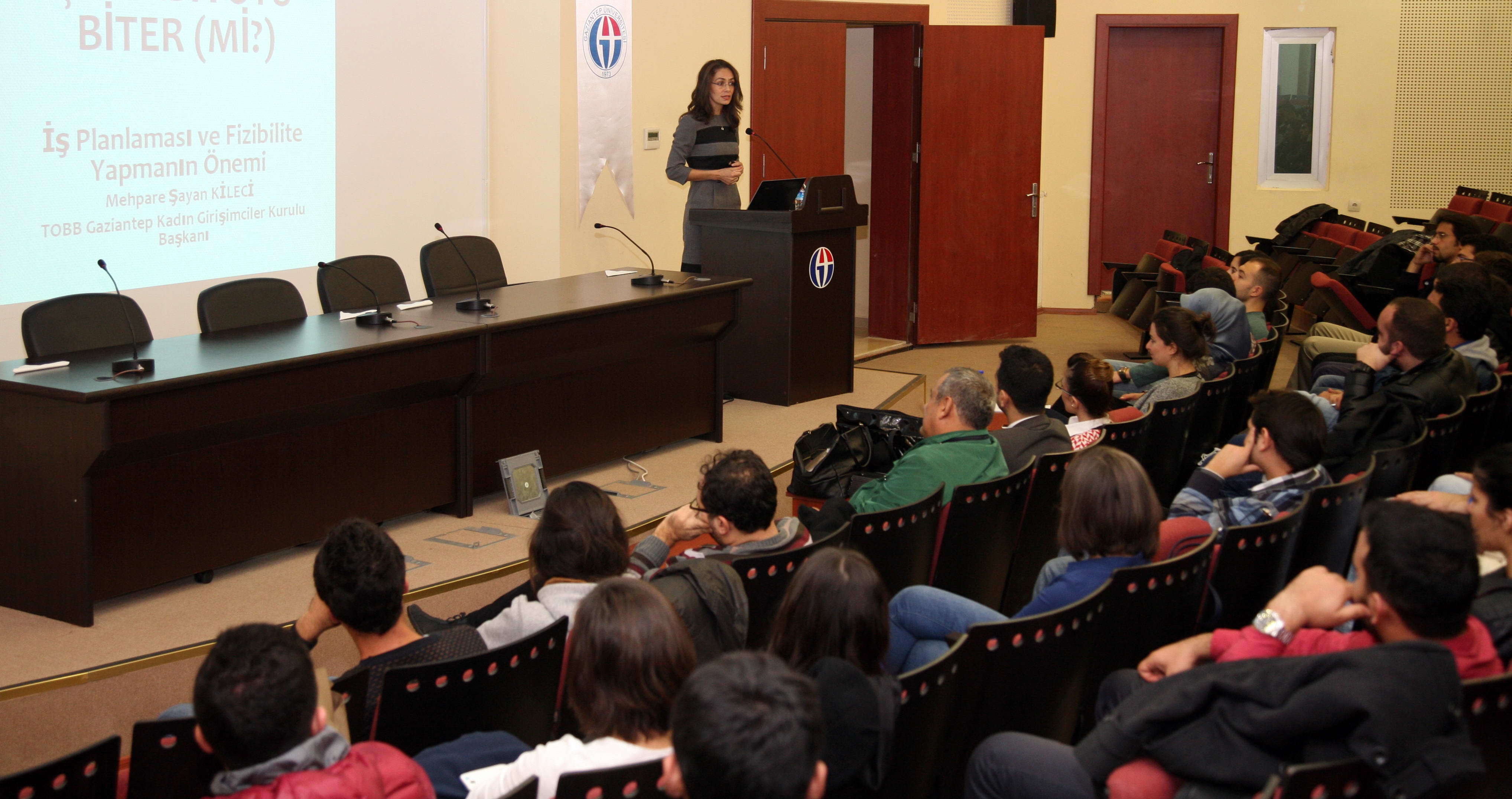 Gaziantep Üniversitesi (GAÜN) Bilinçli Tüketim Topluluğu tarafından, Mühendislik Fakültesi Dekanlık Binası Konferans Salonunda TOBB Gaziantep Kadın Girişimciler Kurulu Başkanı Mehpare Şayan Kileci’nin konuşmacı olarak katıldığı “İş Planlamanın ve Fizibilite Yapmanın Önemi” adlı konferans düzenlendi.