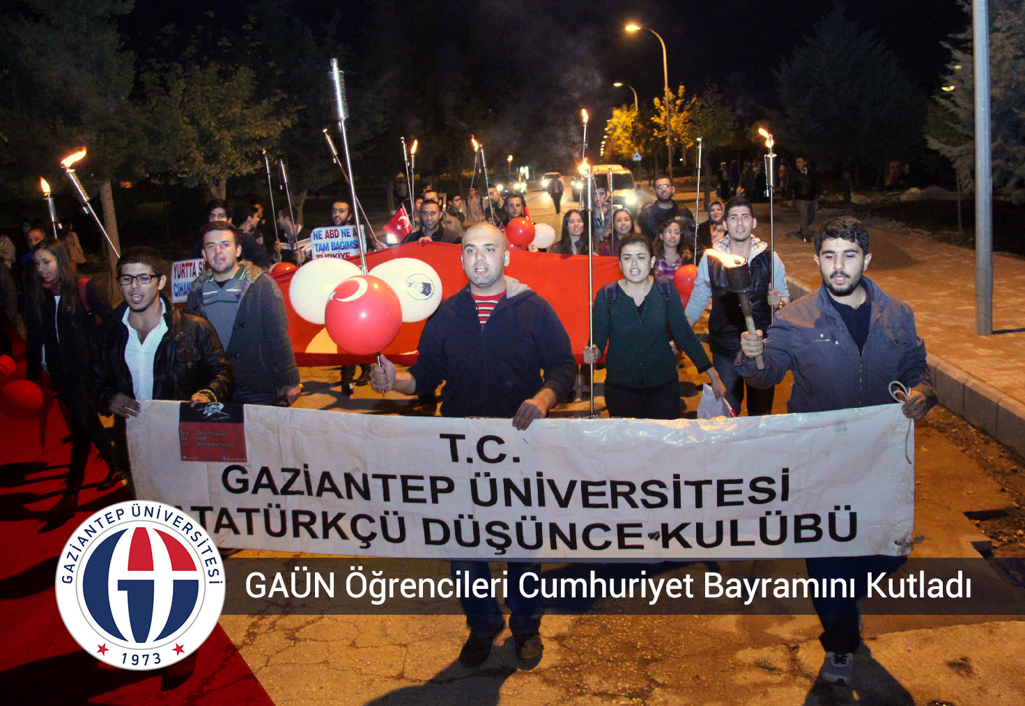Gaziantep Üniversitesi (GAÜN) Atatürkçü Düşünce Topluluğu (ADT) tarafından Cumhuriyetimizin kuruluşunun 91. yıl dönümü etkinlikleri çerçevesinde ‘Fener Alayı’ düzenlendi. GAÜN 80. Yıl Öğrenci Kültür Merkezi önünden başlayarak Atatürk büstüne kadar, ellerinde Türk Bayrakları ve fenerlerle “Şehitler ölmez vatan bölünmez, Ne Mutlu Türküm Diyene, Türk Öğün Çalış Güven, Cumhuriyet düşünce özgürlüğüdür” sloganlarıyla ve 10. Yıl, İzmir, Vatan ve Gençlik Marşları eşliğinde yürüyüşlerini…