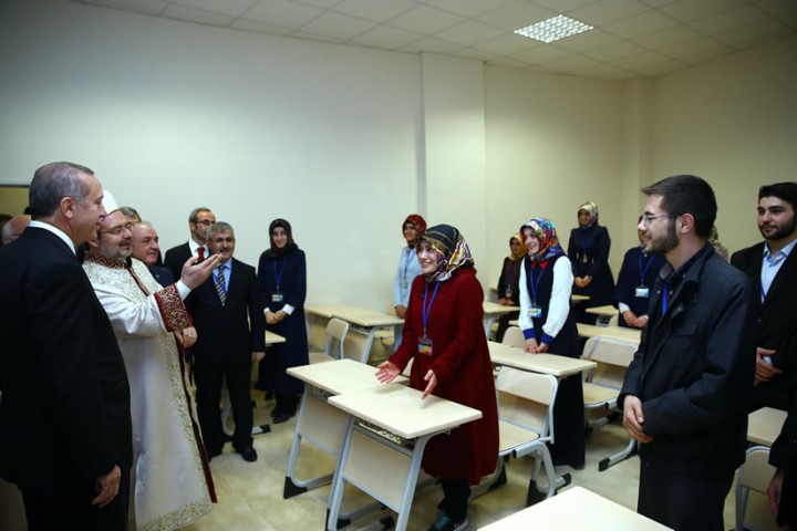 Kuran’ı Kerim okunması ve dua edilmesinin ardından kurdelesi kesilerek resmi açılışı yapılan Sani Konukoğlu İlahiyat Fakültesi’ni gezen Cumhurbaşkanı Erdoğan sınıfları tek tek gezerek öğrencilerle sohbet edip başarı dileklerinde bulundu. Burada Erdoğan’a öğrenciler, üzerinde annesinin resminin olduğu bir portre hediye etti. Cumhurbaşkanı Erdoğan, dışarıda kendisini bekleyen öğrencilerin yanına giderek dileklerini dinleyip, istekleriyle ilgili not aldırdı. Cumhurbaşkanı, öğrencilerin fotoğraf çektirme isteklerini de geri çevirmedi. Cumhurbaşkanlığı otobüsüne binen Erdoğan, öğrencilere içinde satranç takımı bulunduğu öğrenilen hediye kutuları verdi.