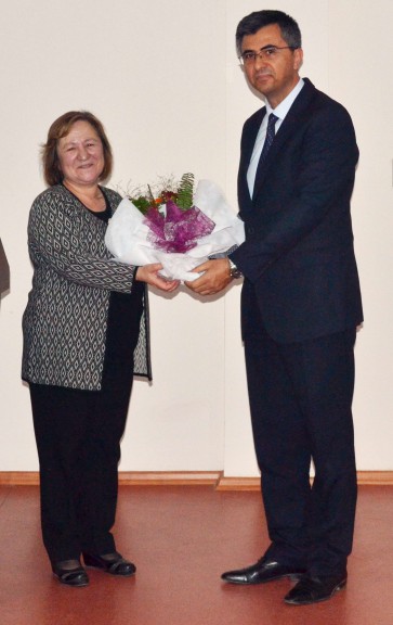 Konuşmasının sonunda öğrencilerin sorularını da cevaplayan Aynur Yıldıran’a Yüksekokul Müdürü Yrd. Doç. Dr. Necip Fazıl Yılmaz tarafından çiçek takdim edildi.