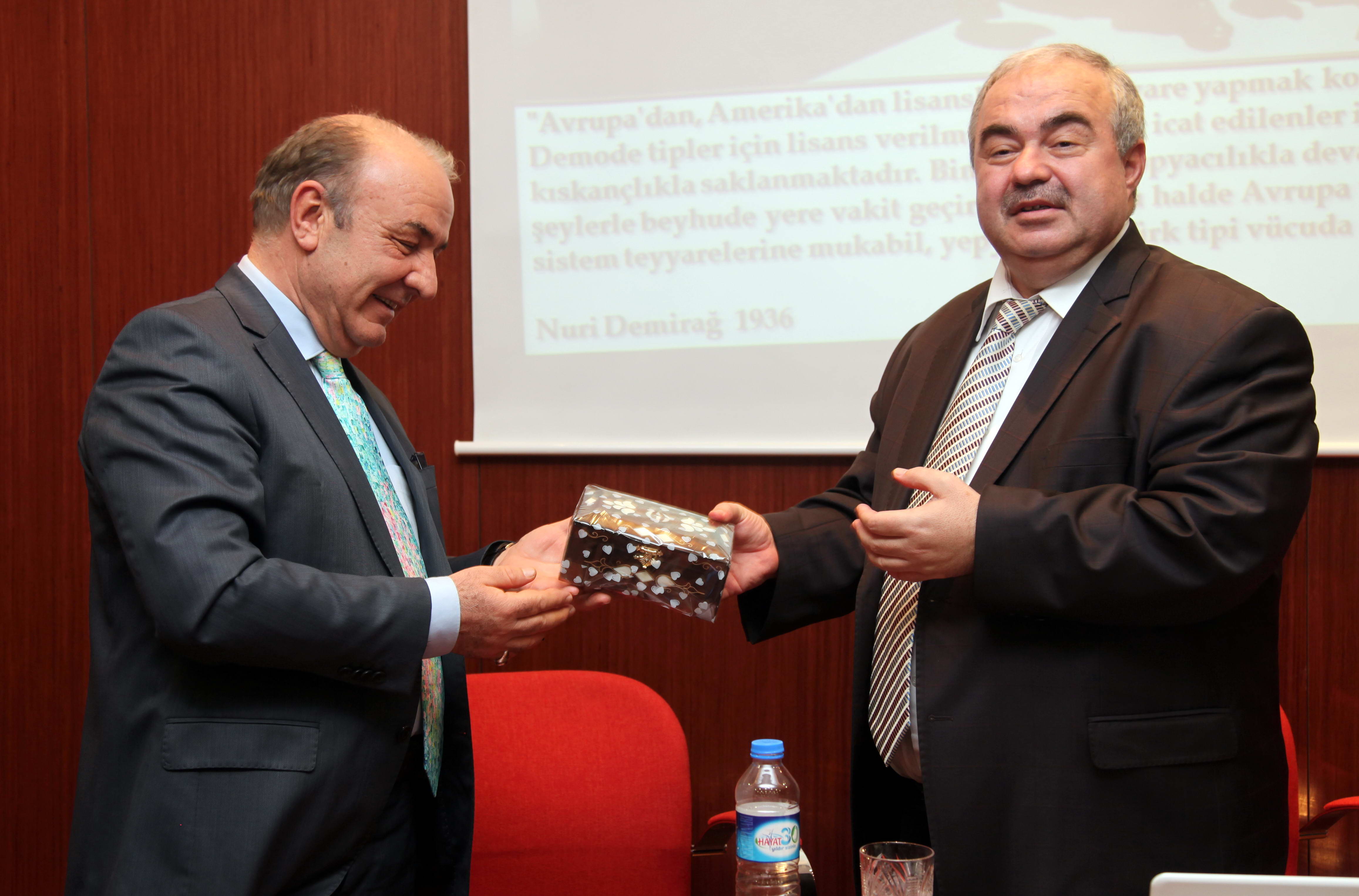 Sunumun ardından GAÜN Rektörü Prof. Dr. Yavuz Coşkun, THY Genel Müdür Danışmanı Halil Tokel’e, sedef işlemeli sandık hediye etti.