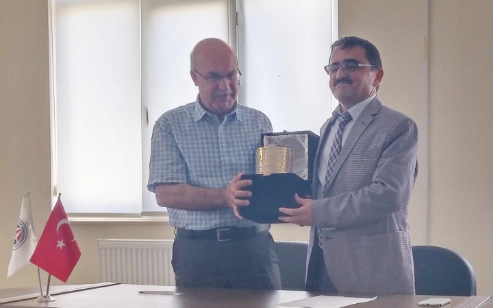 Naci Topçuoğlu Meslek Yüksekokulu öğretim elemanlarının da katıldığı tören sonrasında Yrd. Doç. Dr. Hüseyin Tekin tarafından Prof. Dr. Cahit Bağcı’ya hediye takdim edildi.