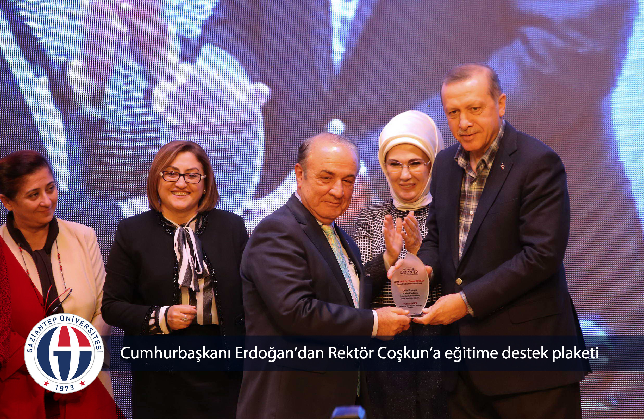 Cumhurbaşkanı Recep Tayyip Erdoğan, Gaziantep Büyükşehir Belediyesi tarafından hayata geçirilen ’Gelin Etmeyin, Okula Gönderin’ projesine katkılarından dolayı Gaziantep Üniversitesi Rektörü Prof. Dr. Yavuz Coşkun’a teşekkür plaketi verdi.