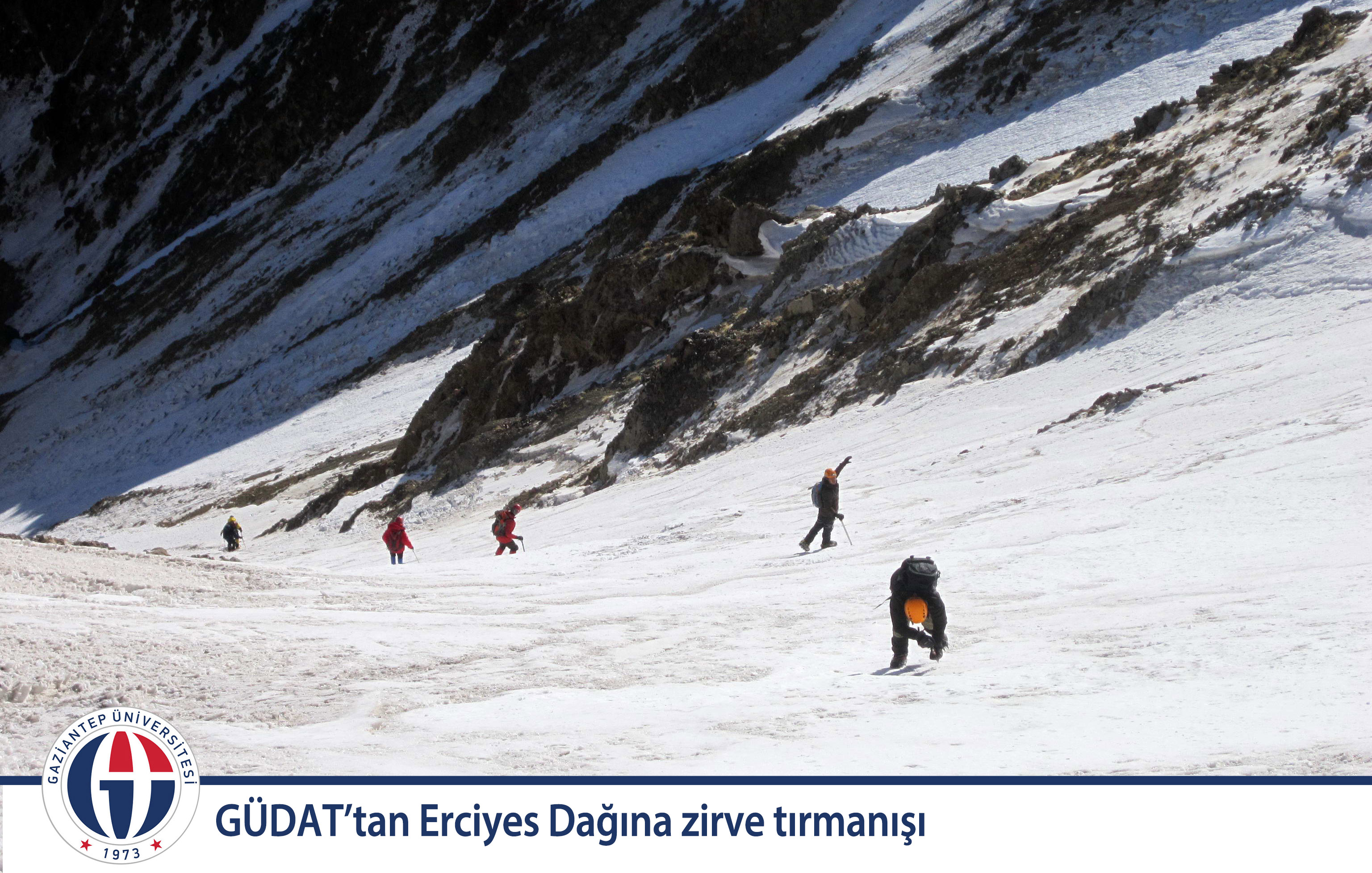 Dağcılıkta kış tırmanışlarının başladığı tarih olan 21 Aralık itibariyle kış zirve tırmanışlarına başlayan Gaziantep Üniversitesi Dağcılık Topluluğu, Erciyes Dağı ile kış zirve tırmanışlarına başladı. Zirve tırmanışı; GÜDAT eğitmenlerinden Murat Özbak, Hakan Sönmez ve Ertuğrul Avşar’ın katılımıyla gerçekleşti. GÜDAT Lideri Ömer Özlü, “Gazi Şehrimiz Gaziantep’in düşman işgalinden kurtuluşunun 94. yılına ithafen, şanlı Türk bayrağımızı, 3 bin 916 metre yüksekliği olan Erciyes Dağı zirvesinde dalgalandırarak, 94 yıl önce yitirdiğimiz 6317 şehidimizi de anmış olduk” dedi.