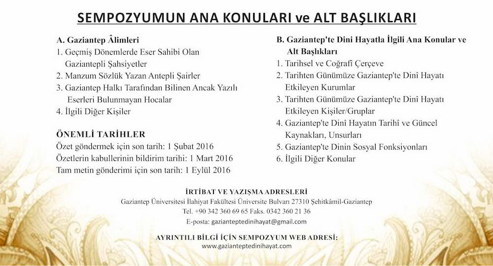 Gaziantep Üniversitesi (GAÜN) İlahiyat Fakültesi ve Gaziantep İl Müftülüğü tarafından 13-15 Ekim 2016 tarihinde, Gaziantep’te dinî eğitime katkı sunmuş şahsiyetlerin hizmet ve faaliyetlerinin tanıtılmasına ve değerlendirilmesine imkân sağlamak ve Gaziantep’in dinî hayatını bütün boyutlarıyla ortaya çıkararak dinî hizmetler sahasında gelecekte üstlenebileceği muhtemel rolün tespitine olanak sağlamak amacıyla “Gaziantep Âlimleri ve Gaziantep’te Dinî Hayat” konulu uluslararası sempozyum gerçekleştirilecektir.