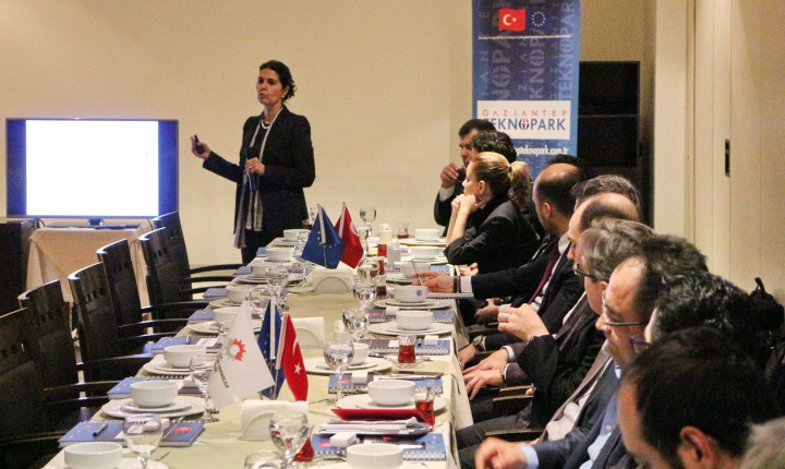 Toplantının açılış konuşmasını ve moderatörlüğünü yapan AB Uzmanı Funda Suran, yaklaşık 2-3 aydan bu yana Gaziantep sanayisinin önde gelen yedi sektörleriyle ilgili çalışmalar yaptıklarını söyledi. Suran, “Teknoparkta yürüyen AB projesinin amaçlarından biri Gaziantep’te yürüyen ARGE ve inovasyon çalışmalarının bir adım daha ileriye götürmek. Bu nedenle hemen hemen her sektörden; halı, gıda, tekstil, makine ve kimya sektöründen olmak üzere sektörün önde gelen temsilcileriyle çok daha geniş kapsamlı toplantılar organize ettik. Bu toplantılardan elde ettiğimiz çıktılardan beklentimiz; Gaziantep’te, ‘Teknoloji Platformunu’ kurmak. Bu konuda birlikte hareket ettiğimiz bir takım kurum ve kuruluşlar var. Bunlar; İKA, KOSGEB ve Bakanlık. Bilindiği gibi Gaziantep’in sanayisi ciddi bir ivme kazanmış durumda. Fakat zirveye çıkmak, zirvede durmaktan çok daha zor. Bu sıçrama, ARGE ve inovasyon ve bilgiye dayanmak zorunda. Bunu da en iyi yakalayabileceğimiz yer üniversiteler, TEKNOPARKLAR ve Teknoloji Transfer Ofisleri. Bugün pek çok genç sanayici temsilcilerimizle Gaziantep’te bir “Think-Tank” (düşünce kuruluşu) kurulabilir mi? Teknoloji Transfer Ofisi bir “Think-Tank” (düşünce kuruluşu) olabilir mi? paylaşmak istiyoruz” diye konuştu.