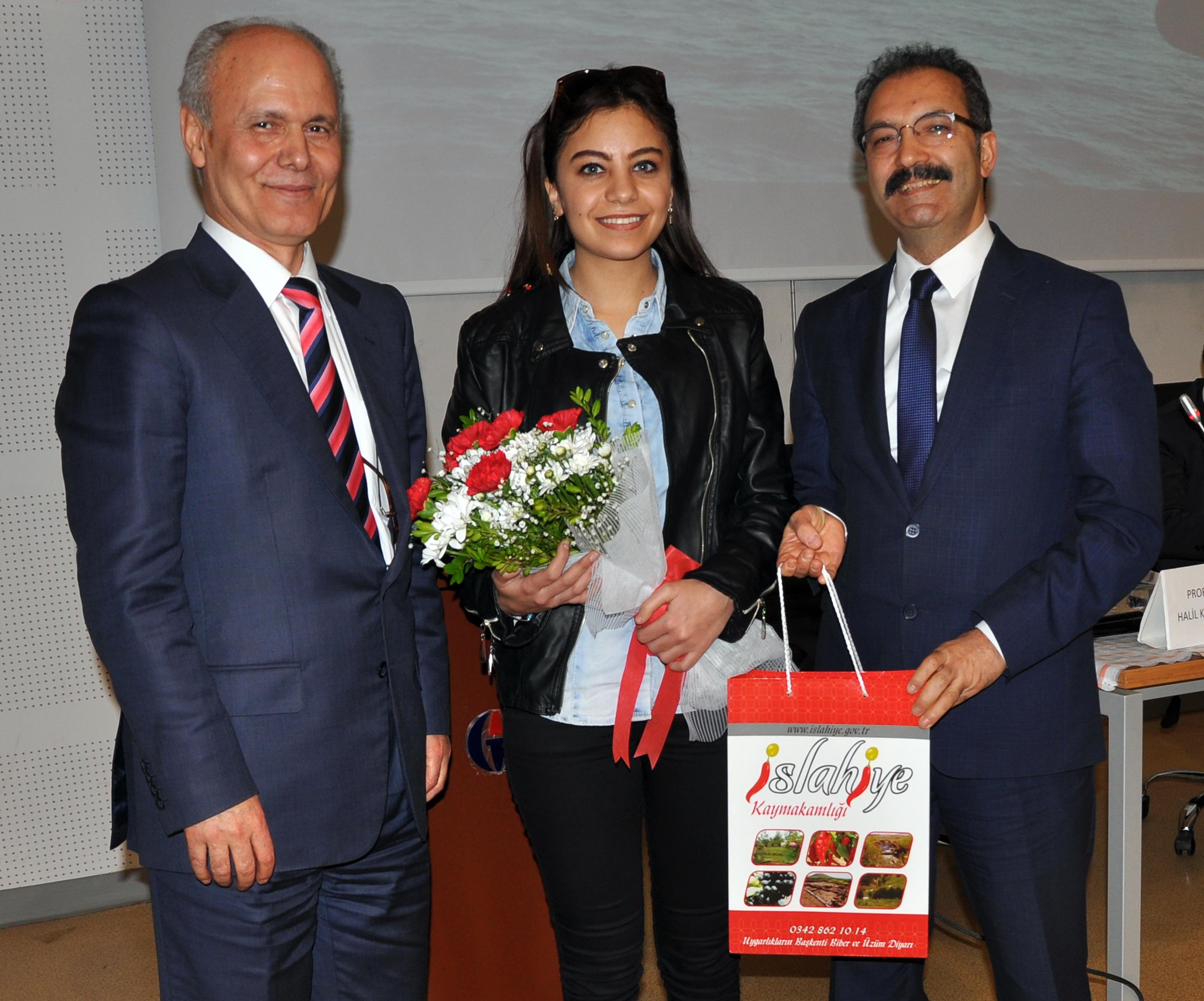 GAÜN İslahiye İİBF Dekanlığı tarafından Prof. Dr. Yavuz Coşkun Konferans Salonu’nda düzenlenen konferansta Rektör Yardımcısı Prof. Dr. Ali Gür ve İslahiye İİBF Dekan vekili Prof. Dr. Hakan Altıntaş konferans veren Prof. Dr. Halil Koyuncu ve Rahim Er’e çiçek ve hediye takdim etti.​