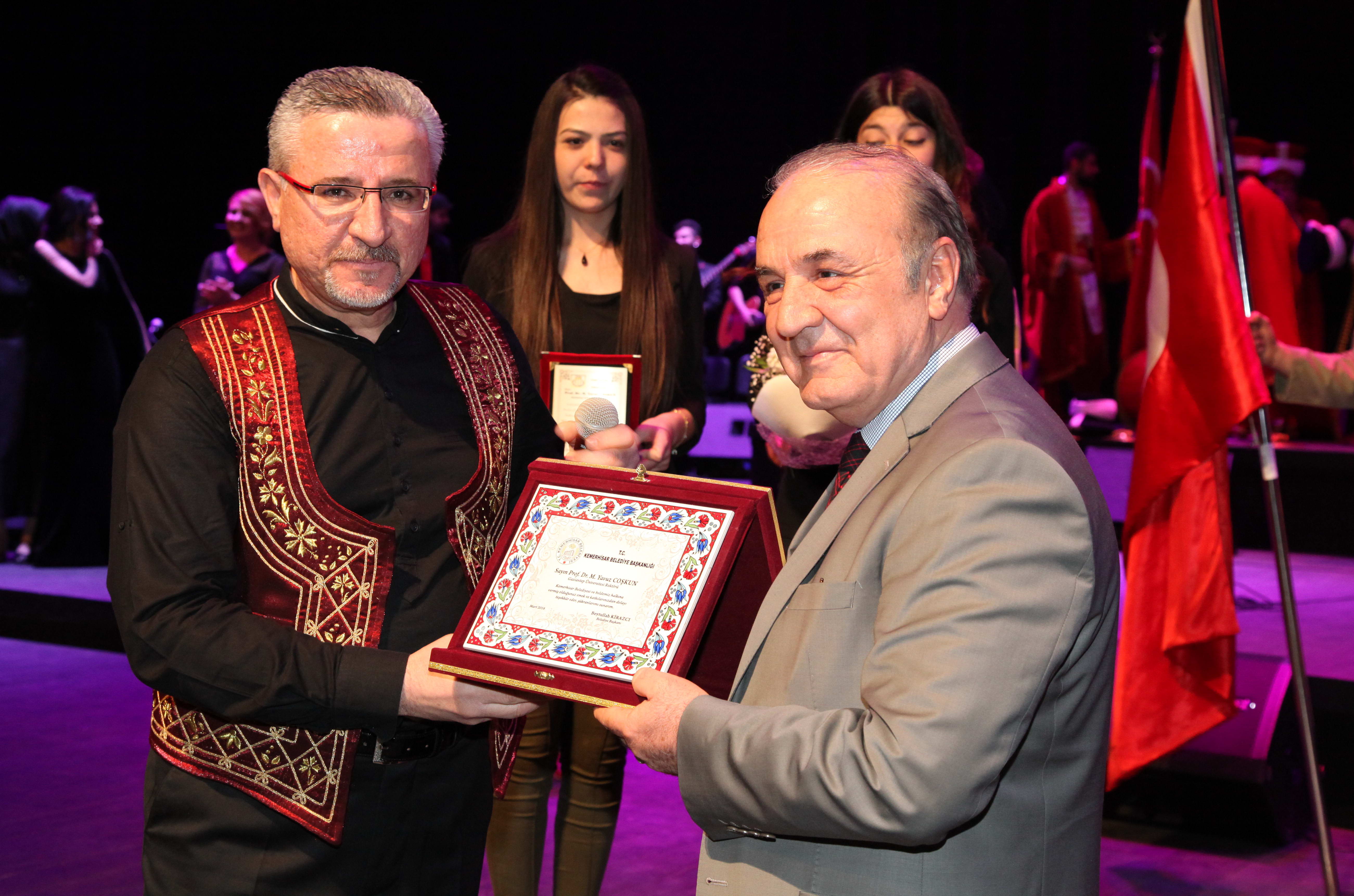 San. Öğr. Elm. Dr. Hakan Tatyüz’e ve ekibe gecenin anısına çiçek takdim eden Rektör Prof. Dr. Yavuz Coşkun, konseri dinlerken oldukça duygulandığını belirttiği konuşmasında, “Gözleri yaşarmayan var mı? Her sene bu konseri dinlerim. Her seferinde gözlerim yaşarır. Akif’in ‘Sana dar gelmeyecek makberi kimler kazsın, gömelim gel seni tarihe desem sığmazsın’ dediği şehitlerimiz, o değerli şerefli insanlar sayesinde bu vatan ayakta. Biz onları unutmadık, unutturmayacağız da. Onlar bu vatanı bize emanet ettiler. Biz de bu vatanı Büyük Atatürk’ün söylediği gibi payidar kılmak için herkes hepimiz birlikte yürek yüreğe, kol kola omuz omuza çalışacağız” dedi.