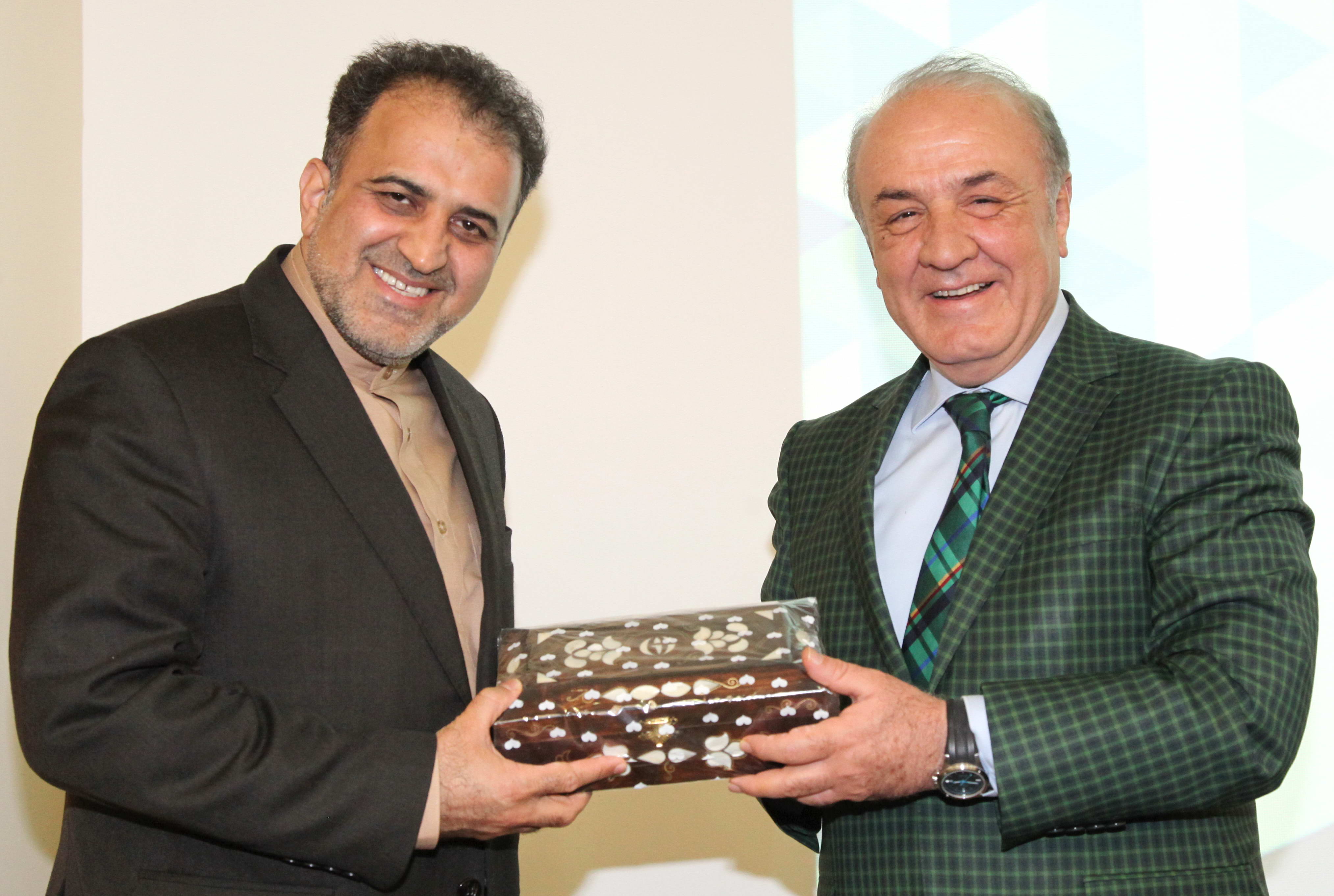 Konferans sonrasında GAÜN Rektörü Prof. Dr. Yavuz Coşkun, D-8 Ekonomik İşbirliği Örgütü Genel Sekreteri Seyyid Ali Muhammed Musavi’ye teşekkür ederek, GAÜN işlemeli bir sedef sandık hediye etti.