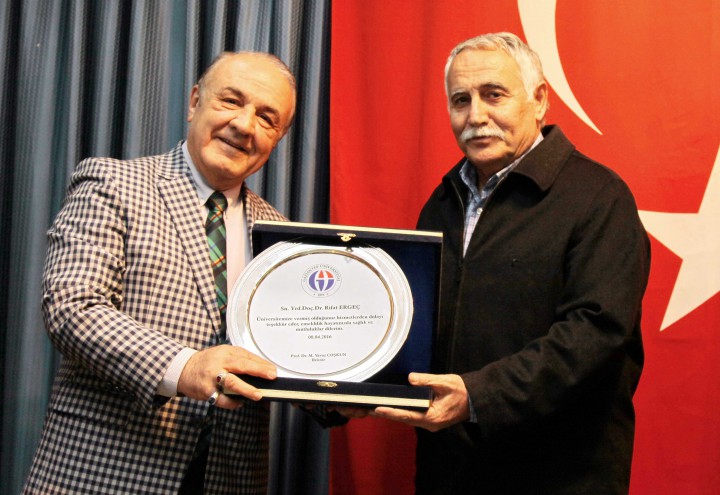 Konuşmaların sonrasında Rektör Prof. Dr. Coşkun ve Fen Edebiyat Fakültesi Dekanı Prof. Dr. Adil Kılıç tarafından Yrd. Doç. Dr. Rifat Ergeç’e hediye takdim edildi.