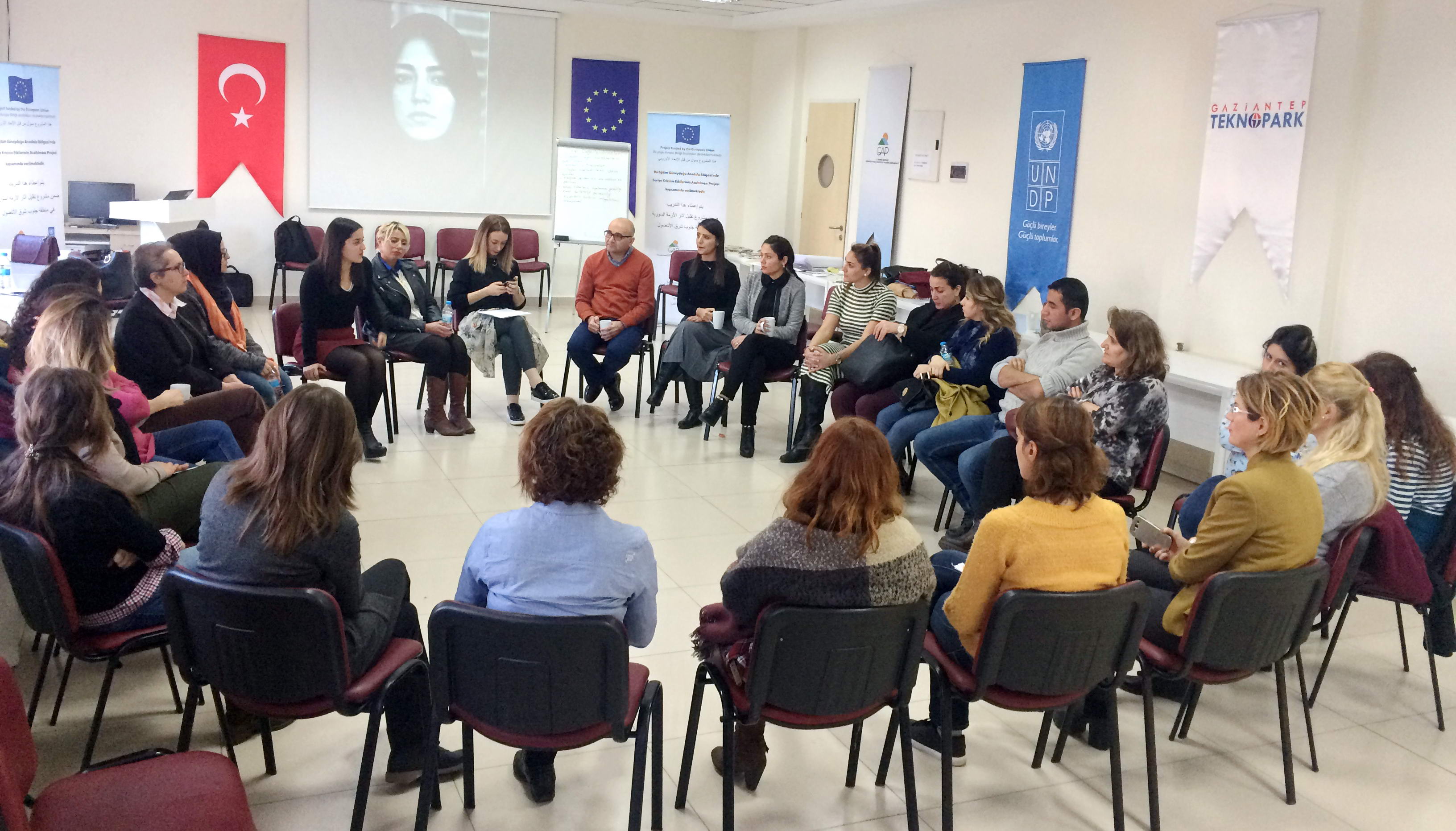 Gaziantep Üniversitesi , Gaziantep Üniversitesi TargeT Teknoloji Transfer Ofisi ve Birleşmiş Milletler Kalkınma Programı -Gaziantep (UNDP-Gaziantep) işbirliğiyle GAÜN TEKNOPARK Seminer Salonunda “Dünyayı Turuncuya Boyayın …!, Kadınlara Şiddeti Sonlandırmak için Birleşin” programı bünyesinde, Kadın Akademisyenler ve öğrencilerle bir toplantı gerçekleştirdi.