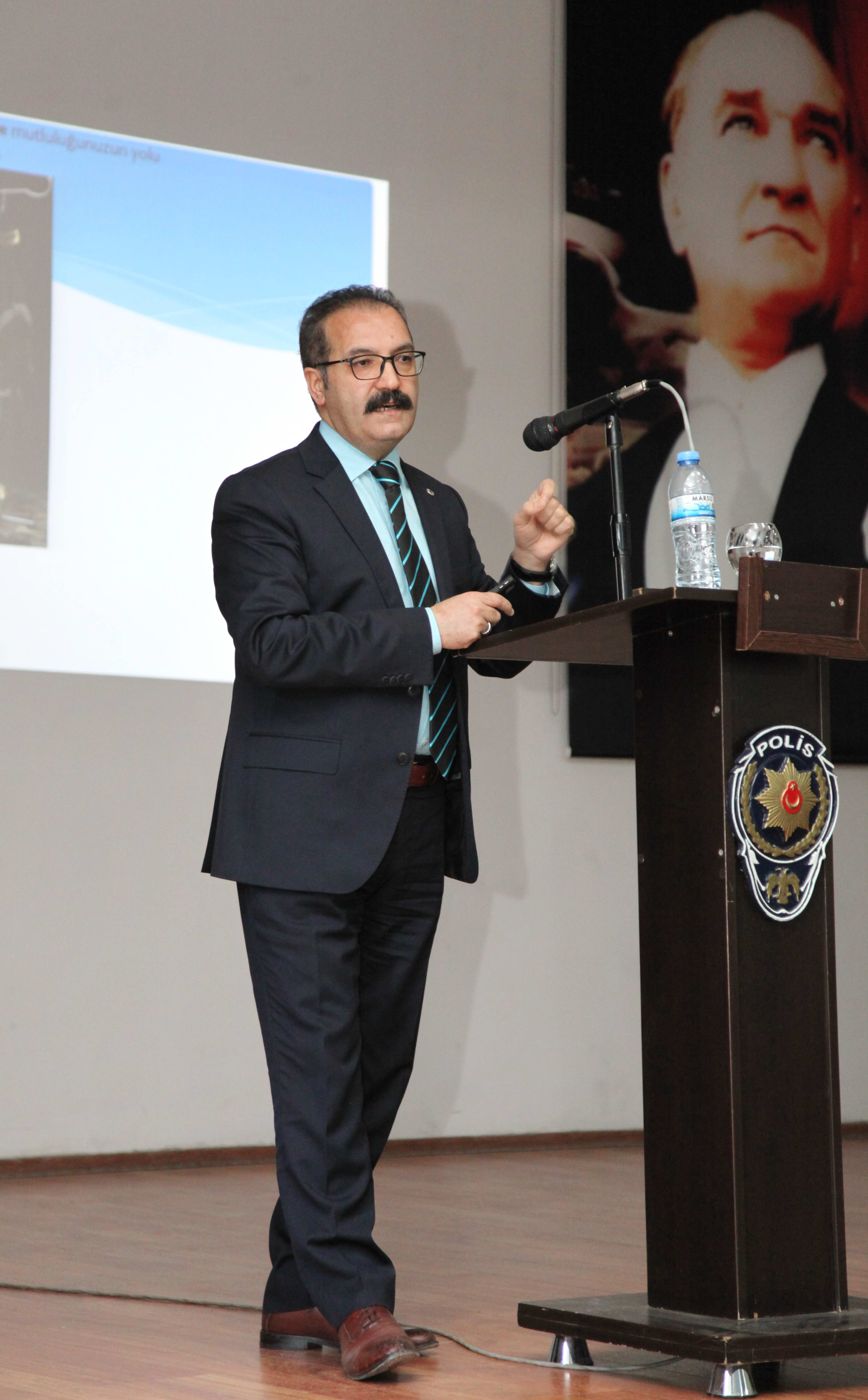 Polis adaylarına sosyal medyayı yararlı yönleriyle kullanmaları çağrısında da bulunan Rektör Prof. Dr. Ali Gür, “Sosyal medya denilen şey hayatımızı o kadar esir almış ki. Bakıyorsunuz ‘Falanca yerde restauranttayım, filanca yerde şunu yedim. Affedersiniz, neredeyse tuvalette bire yer bildirimi yapılır hale geldi. Yiyen var, yiyemeyen var. Eskiden aile mahremiyeti diye bir şey vardı. Peki bunları biz niye yapıyoruz? Beğeni, toplumda statü kazanma arzusu bu da aslına bakarsanız bizim toplumdaki beğenilme arzusundan kaynaklanan stres faktörünü yönetemeyişimizdendir” dedi. Toplumun dayattığı yargılar üzerinden hareket ettiğimizi, toplum için yaşadığımızı vurgulayan Rektör Gür, “Ama, toplum dediğinizde gelen ahlaki etik inançsal kurallara bağlı toplum değil, bize dayatılmış, öğretilmiş küçük topluluklar üzerinden yönetiliyoruz maalesef. Eğer mutlu olmak istiyorsanız, toplumun da mutluluğunu hesaba katın. Toplum mutluysa siz de mutlusunuz. Huzursuz bir toplum, döner sizi de huzursuz yapar. Hani hep söyledim ya algılar üzerinden hareket etmek, algı yönetiyor bizi. Güçlüler her zaman tarihi yazdıklarını ve aynı zamanda da bize dikte ettirdiklerini düşünürler. Bu konuda özellikle batı ve doğu ikilemi üzerinden maalesef güçlü batı olduğu için şu anda algılarla bizi yöneterek, hem bize zulmediyor, elimizdeki imkanları alıyor, hem de bize baskı uygulayarak biraz önce yaptığı gibi ‘Siz adam olmazsınız, siz katilsiniz, siz teröristsiniz, siz demokrasiden anlamazsınız’ diyerek korkunç bir strese mahkum bırakıyor bizi. Hem, özgürlüklerimizi, ekonomik imkanlarımızı, alt yapı kaynaklarımızı elimizden alıyor. Hem de tepemize vururken de aldıklarını ‘Ben sen adam olasın diye buradayım diyerek de bizim tepemize hükümran oluyor.