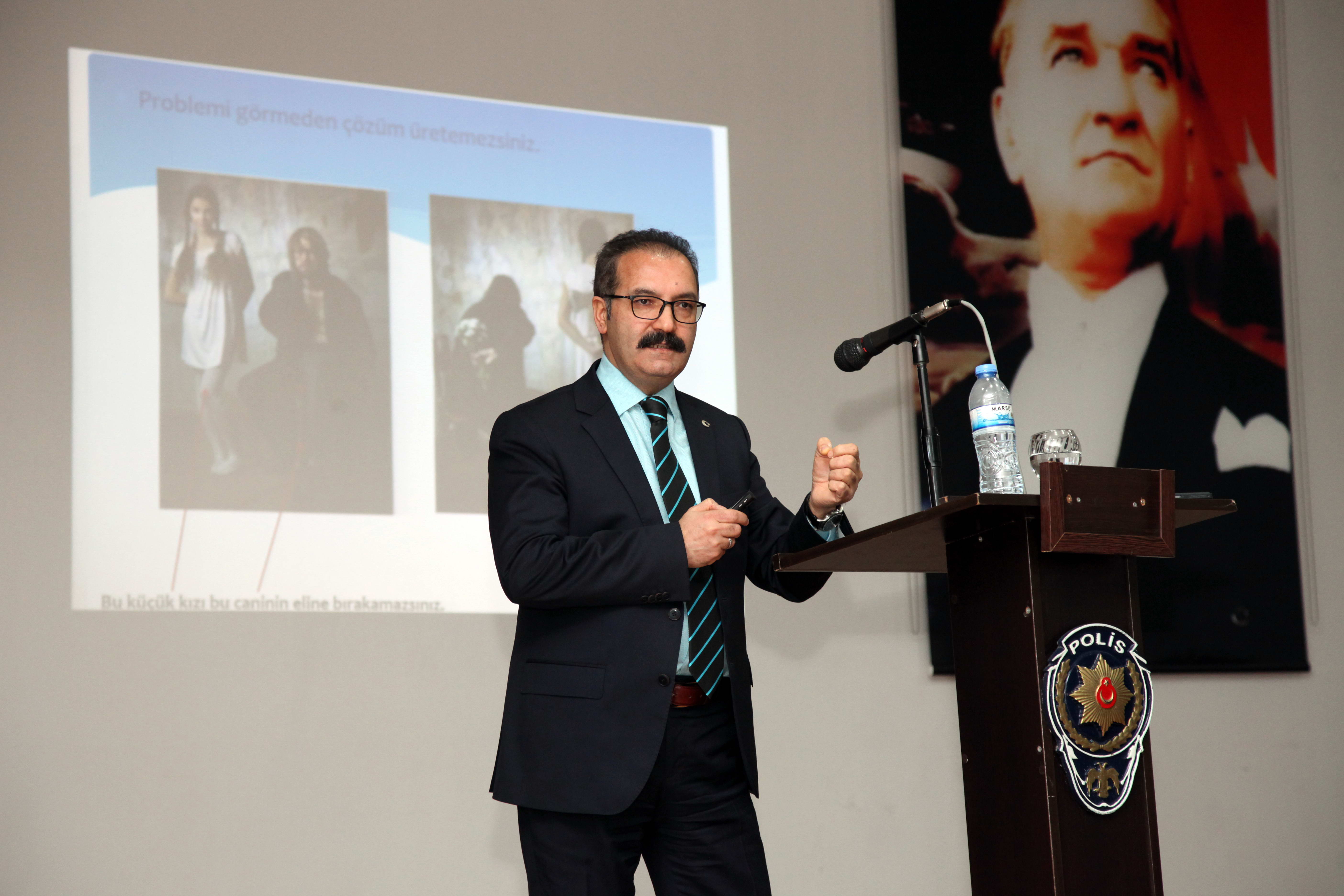 Ön yargıların, da muhatabını dinlememeyi ve empati yapmadan kavgaya yol açtığını kaydeden GAÜN Rektörü Prof. Dr. Ali Gür, “Eğer bir konuda bilgimiz varsa oturup çok rahat konuşabiliriz. Nereden baktığımızı eğer ortaya koymazsak, bakış açımızı düzeltmezsek, bakış açılarımıza göre değerlendirme yapmazsak, ne toplumu okuyabiliriz, ne de toplumda gerilim oluşturan stresleri doğru yönlendirebiliriz” dedi. Bu konuda meslek olarak polisin çok risk haritasının yüksek olduğuna işaret eden Prof. Dr. Gür, şöyle devam etti: “Çünkü, sizin kendi bireysel, aile, şahsi riskleriniz var. Bir de toplumun risklerini de, streslerini de toplum polisi ve aynı zamanda diğer görevlerdeki istikbali manada ve asayiş anlamda da bakarsanız bütün streslerle siz karşı karşıyasınız. Siz kendi streslerinizi baş etme yöntemi geliştireceksiniz. Toplumun da stresini azaltıp onları da doğru yönlendireceksiniz. Düşünsenize, görünümü polis ama ruhu satılmış birisinin yanlış bir hareketi toplumda nelere mal olabiliyor? Yaşadık bunu. Son Rus Büyükelçi suikastında gördük. Bir polis memurunun yanlışı, zaten sıkıntılı bir süreçte olan ülkemizde çok daha sıkıntılı bir günler yaşatabilirdi.”