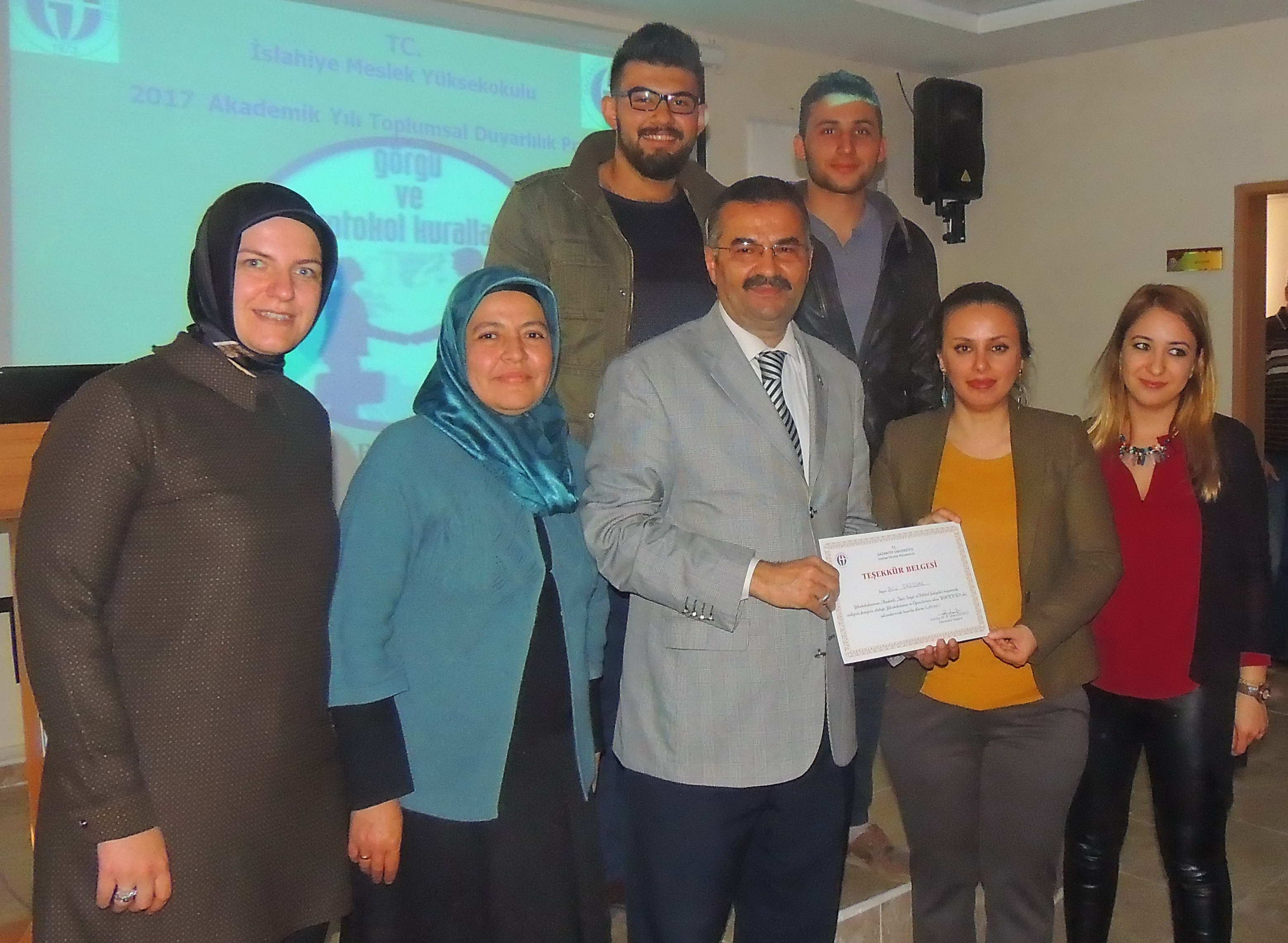 Toplumsal Duyarlılık Projeleri kapsamında uygulamaya konulan ‘Görgü ve Protokol Kuralları Projesi’ kapsamında bu konferansı gerçekleştirdiklerini aktaran İslahiye Meslek Yüksekokulu Müdürü Yrd. Doç. Dr. H. Ahmet Deveci, proje kapsamında orta dereceli okul öğrencilerine ve kamu kuruluş personellerine seri konferanslar verileceğini söyledi. Konferansı veren Uzm. Bilal Erdoğan’a teşekkür belgesi takdim eden Yrd. Doç. Dr. Deveci, anlatılan konuların öğrencilere hayatları boyunca uygulaması gereken kurallar olduğunu vurguladı.
