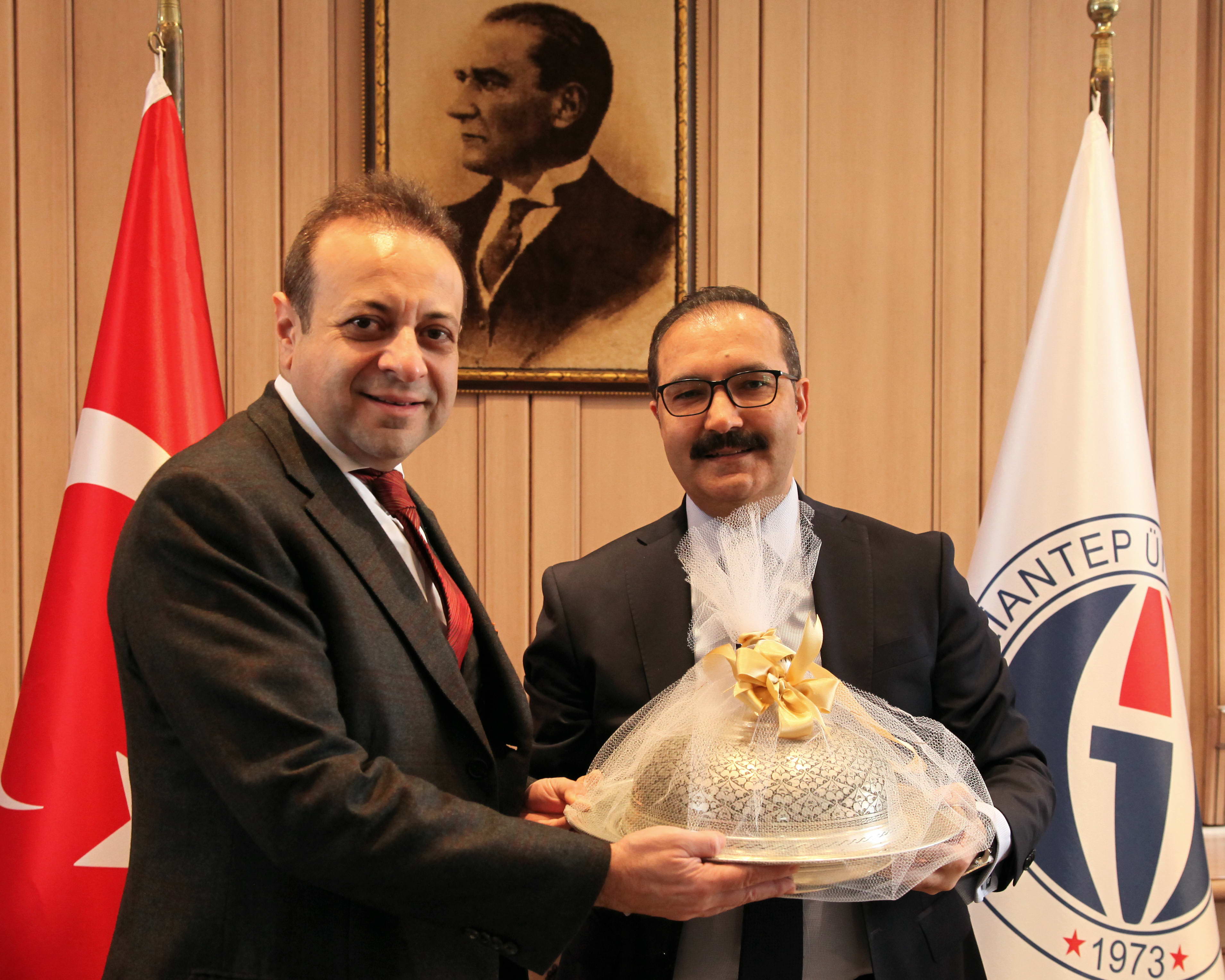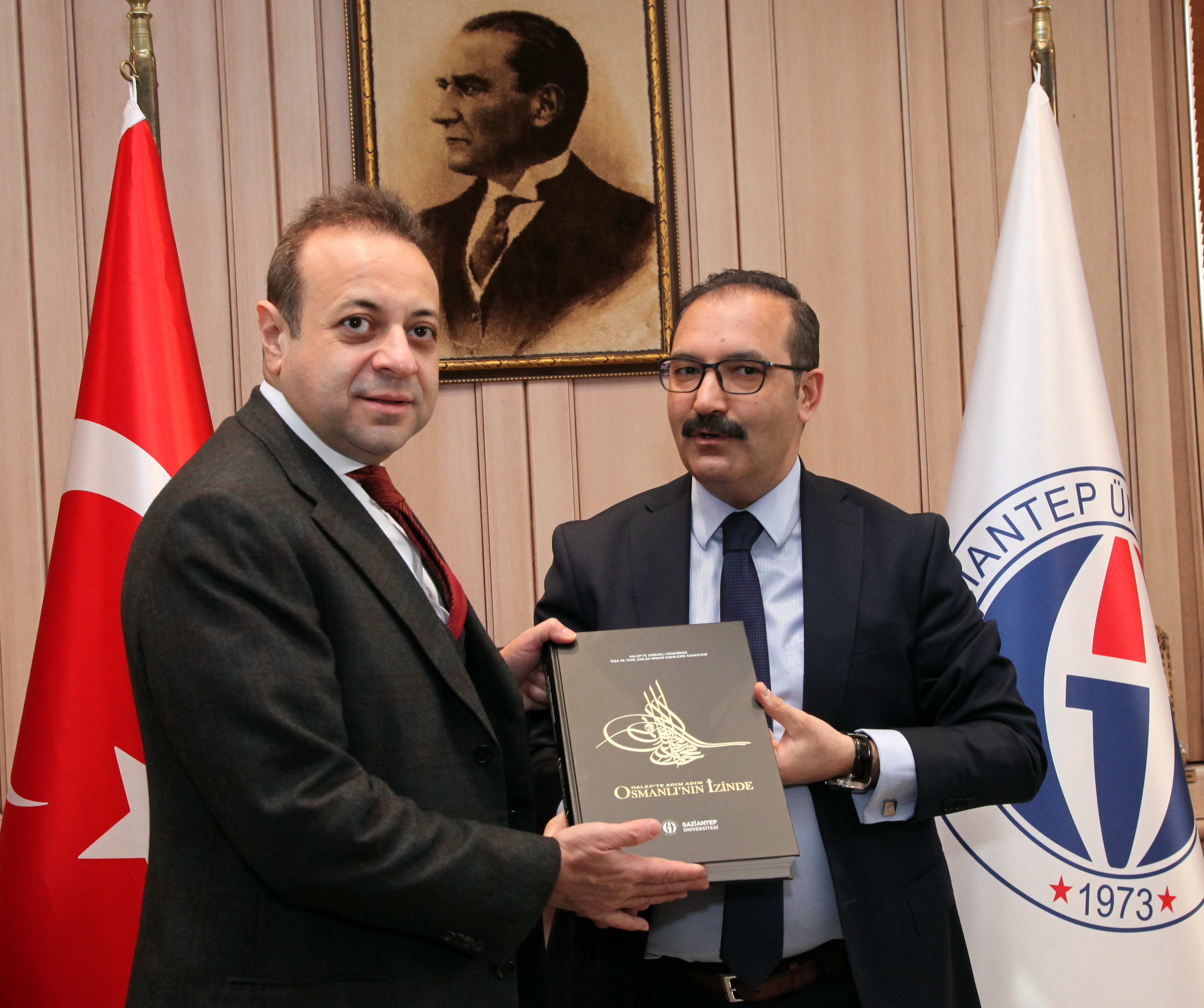 Ziyarette Rektör Gür, eski Bakan Bağış’a Gaziantep Üniversitesi tarafından Halep’in yok edilmeden önceki tarihi eserlerinin tanıtıldığı Halep’te Adım Adım Osmanlı’nın izinde adlı kitap ve bakır işlemeli yemek tabağı hediye etti.