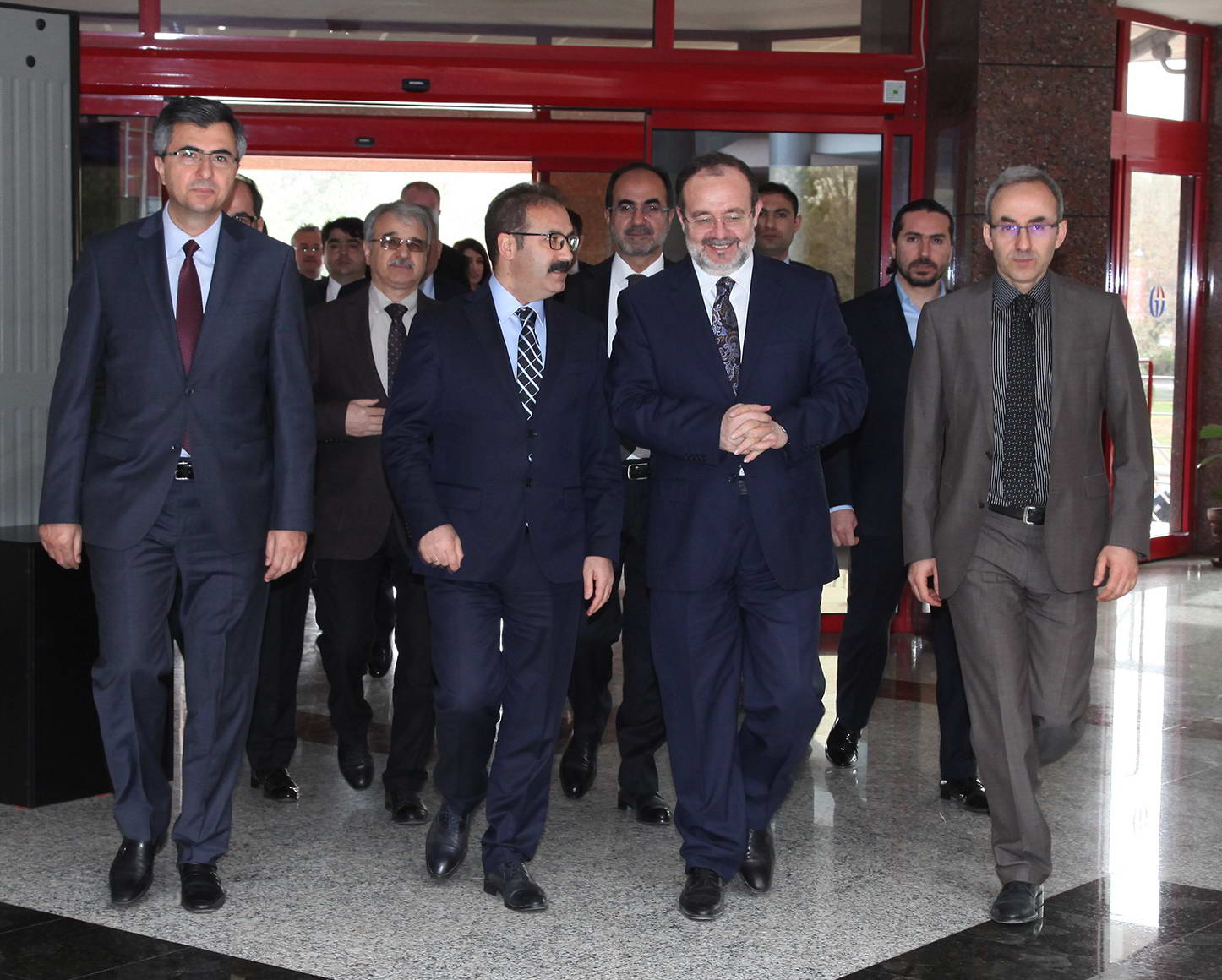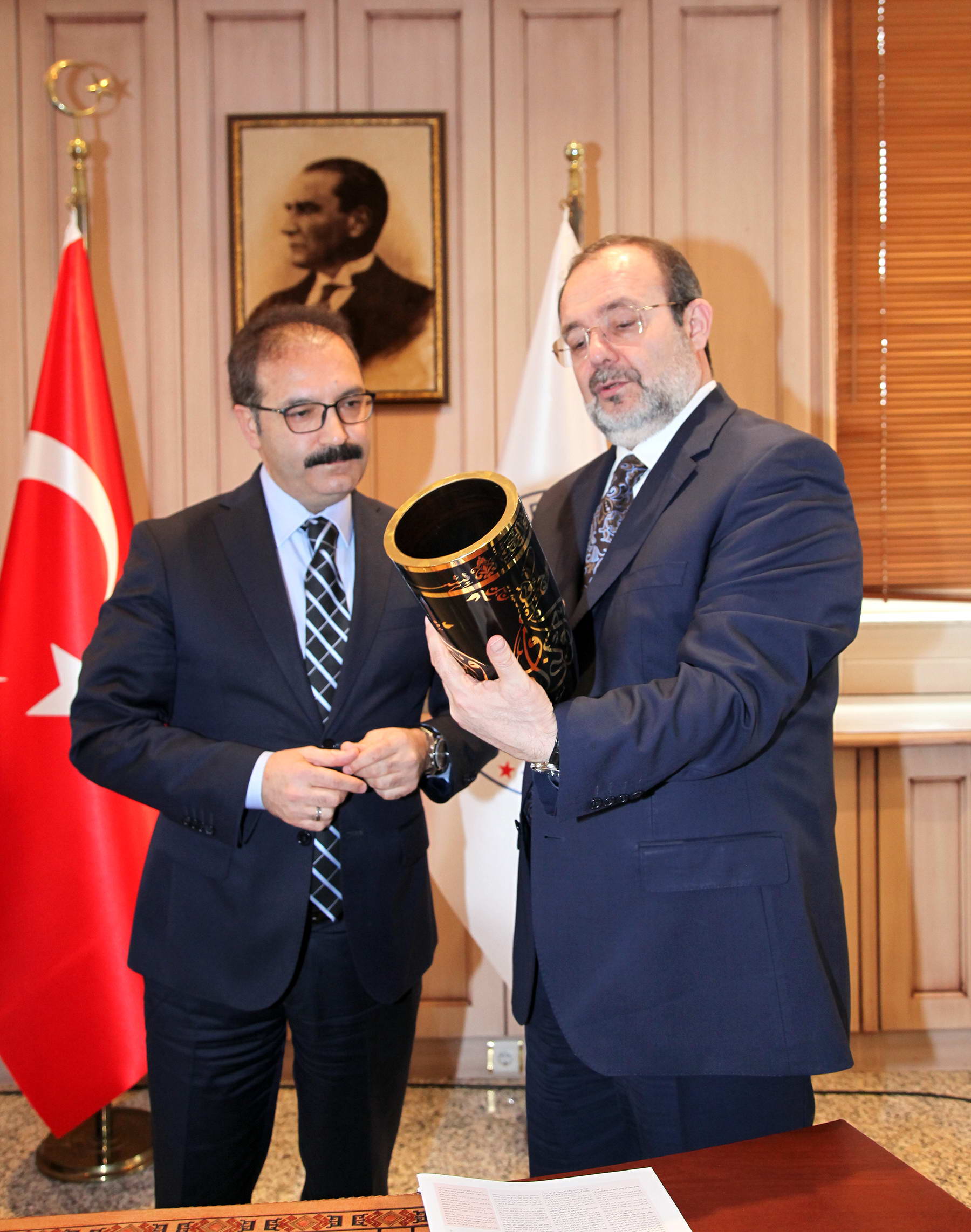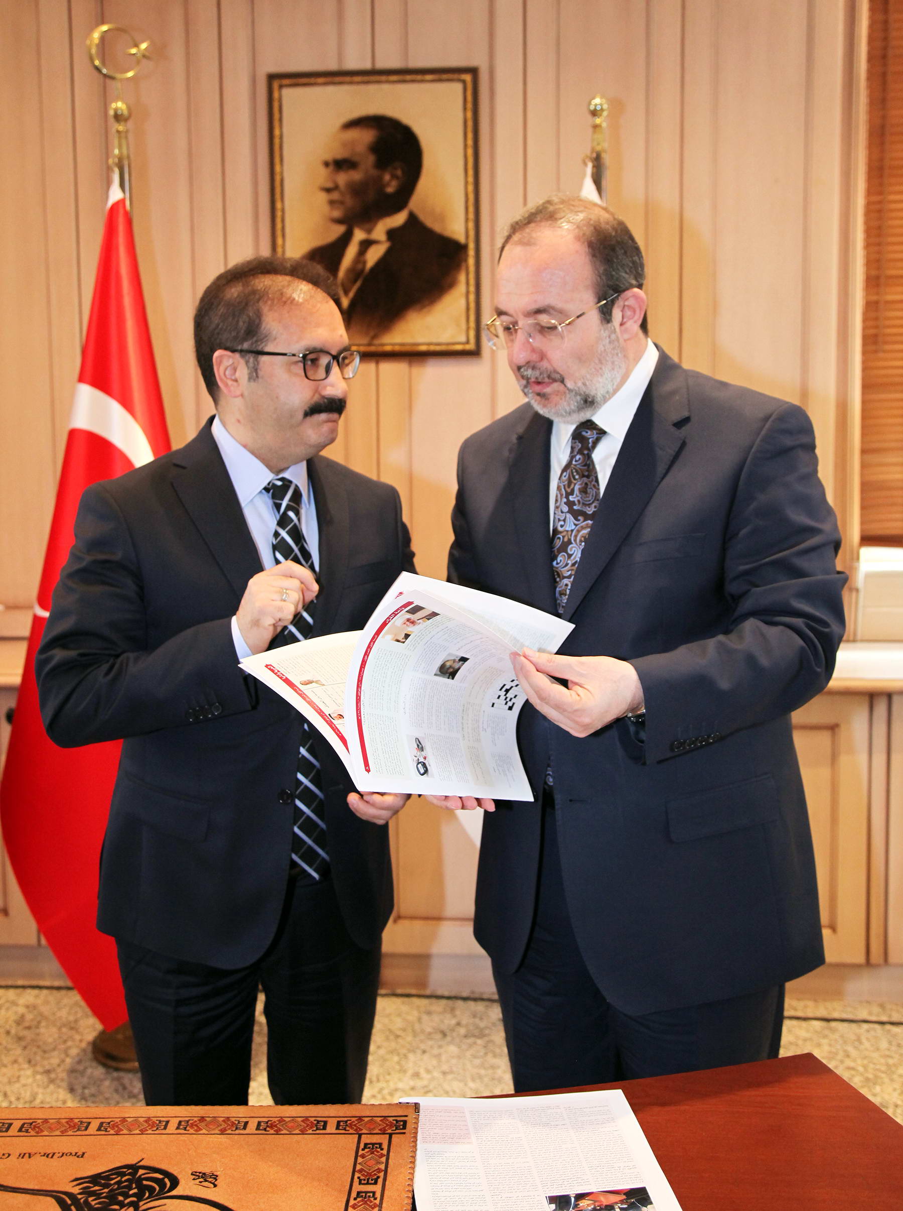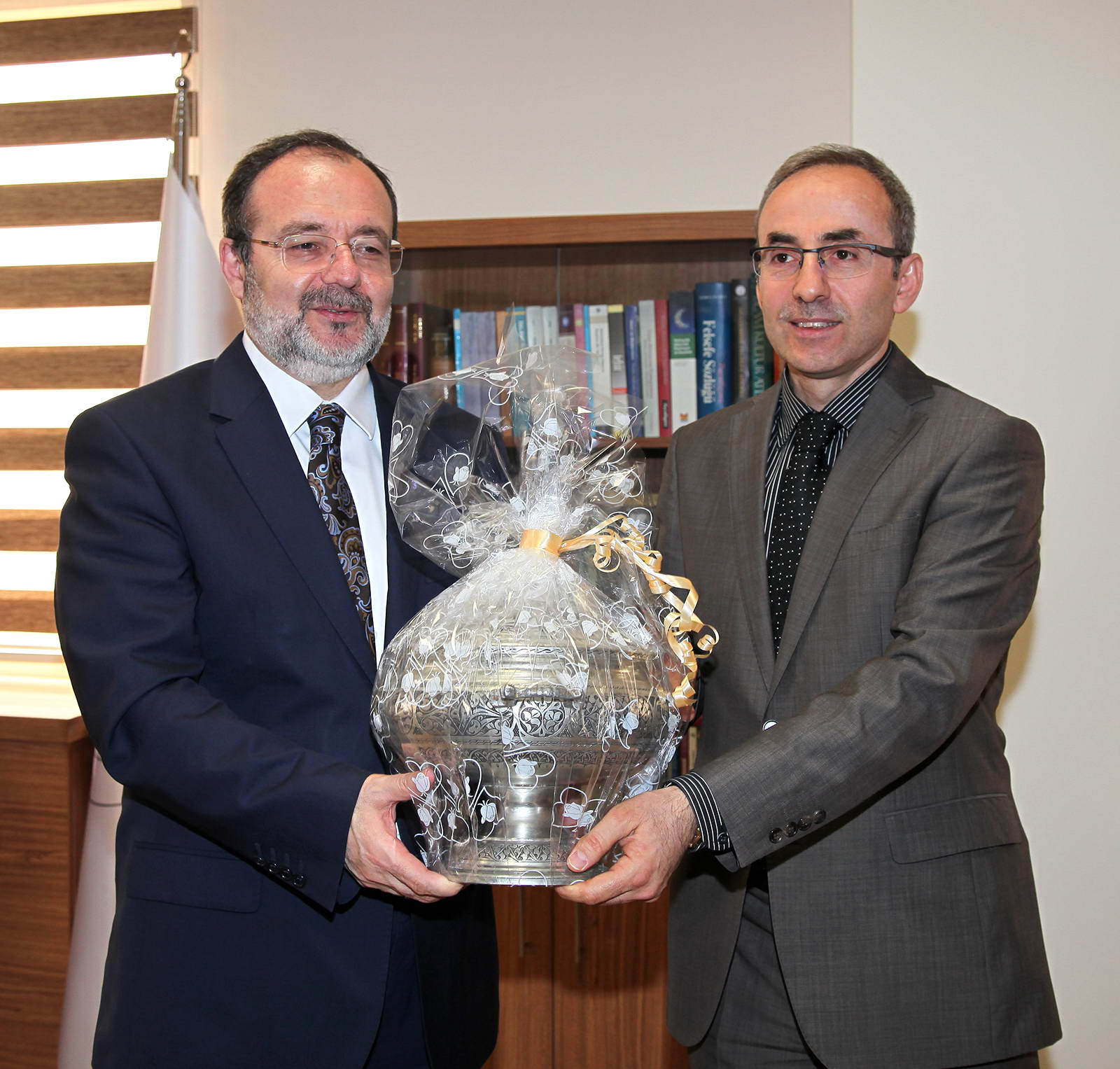 Rektör yardımcıları Prof. Dr. Savaş Gürsoy ve Prof. Dr. Metin Bedir, Genel Sekreter Doç. Dr. Ayhan Doğan, İlahiyat Fakültesi Dekan Vekili Prof. Dr. Sehmus Demir, Rektör Danışmanı Doç. Dr. Necip Fazıl Yılmaz, Genel Sekreter Yardımcısı Mehmet Ali Eminoğlu, İl Müftüsü Ahmet Çelik ve Diyanet yöneticilerinin de bulunduğu ziyarette, Diyanet Başkanı Prof. Dr. Görmez Rektör Prof. Dr. Ali Gür’e Hadislerle İslam Seti hediye ederken, Rektör Gür de Başkan Görmez’e Naci Topçuoğlu Meslek Yüksekokulu öğrencilerinin işlediği çini vazo ile, savaş öncesi Halep’te bulunan ve yok olan eserlerin envanterinin olduğu Halep’te Adım Adım Osmanlının İzinde Kitabı takdim etti. Kitabı dikkatle inceleyen Başkan Görmez, “Halep’te sadece canlar yok edilmedi. Halep’te medeniyetler de yok edildi” dedi. Görmez, daha sonra İlahiyat Fakültesi’nde de incelemelerde bulundu. Burada öğrencilerle sohbet eden Diyanet İşleri Başkanı Prof. Dr. Mehmet Görmez’e Dekan Vekili Demir tarafından bakır işlemeli şamdan hediye edildi.