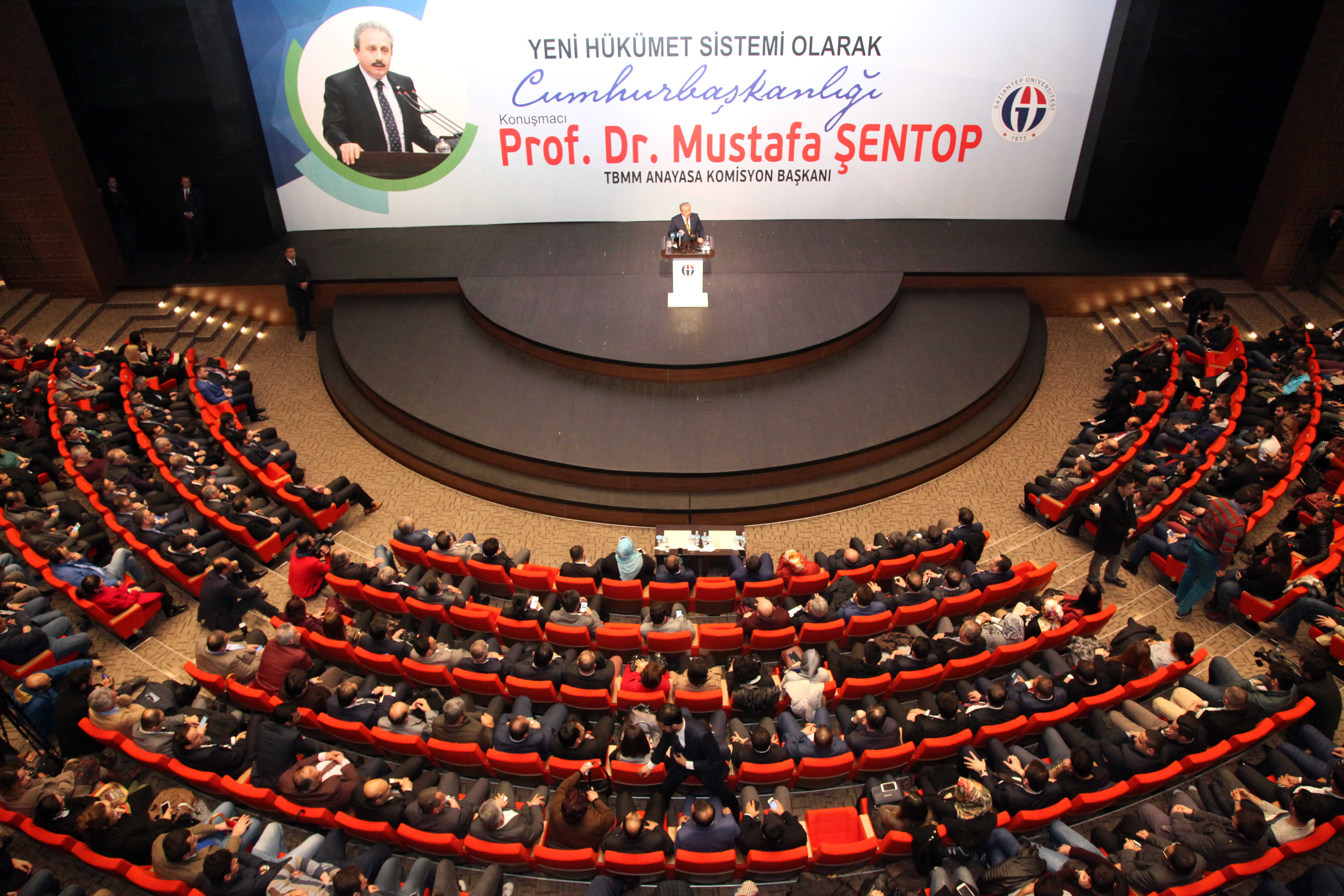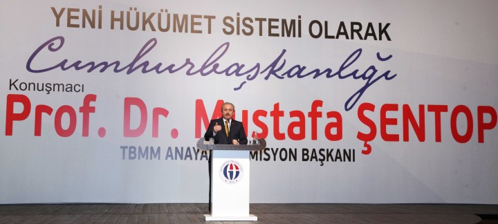 Konferansta; ilk defa 10 Ağustos 2014’te Cumhurbaşkanının doğrudan halk tarafından seçildiğini söyleyen Prof. Dr. Mustafa Şentop, yapılan bu sistem değişikliği ile Cumhurbaşkanının doğrudan halk tarafından seçilmesinin aslında bir hükümet sistemini gösterdiğini söyledi. “2007 öncesinde yazılmış Türkiye’de Anayasa Hukuku kitaplarında Cumhurbaşkanının doğrudan halk tarafından seçildiği sistemler Yarı Başkanlık sistemleridir” diyen Prof. Dr. Şentop, “Aslında Türkiye 2007’de Yarı Başkanlık Sistemine geçti. Ama şöyle bir sıkıntı var; sadece seçim usulü ve onunla bağlantılı meseleler değiştirildiği için genel olarak hükümet sistemi yaklaşımıyla bir değişiklik yapılmadığı için 1982’de parlamenter sisteme göre tasarlanmış bir hükümet yapısı 2007’de yarı başkanlığa dönüştürüldü. Bir taraftan parlamenter sistem bir taraftan genel başkanlık sistemi olan karmaşık hükümet sistemi yapısı 2007’den beri var. İşte bunu da giderme mecburiyeti, zarureti vardı” şeklinde konuştu.