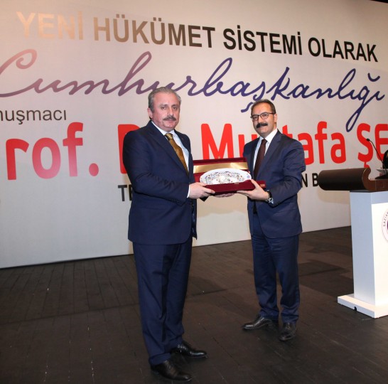 Konferansın sonunda Rektör Prof. Dr. Ali Gür tarafından TBMM Anayasa Komisyon Başkanı Prof. Dr. Mustafa Şentop’a günün anısına hediye takdim edildi.