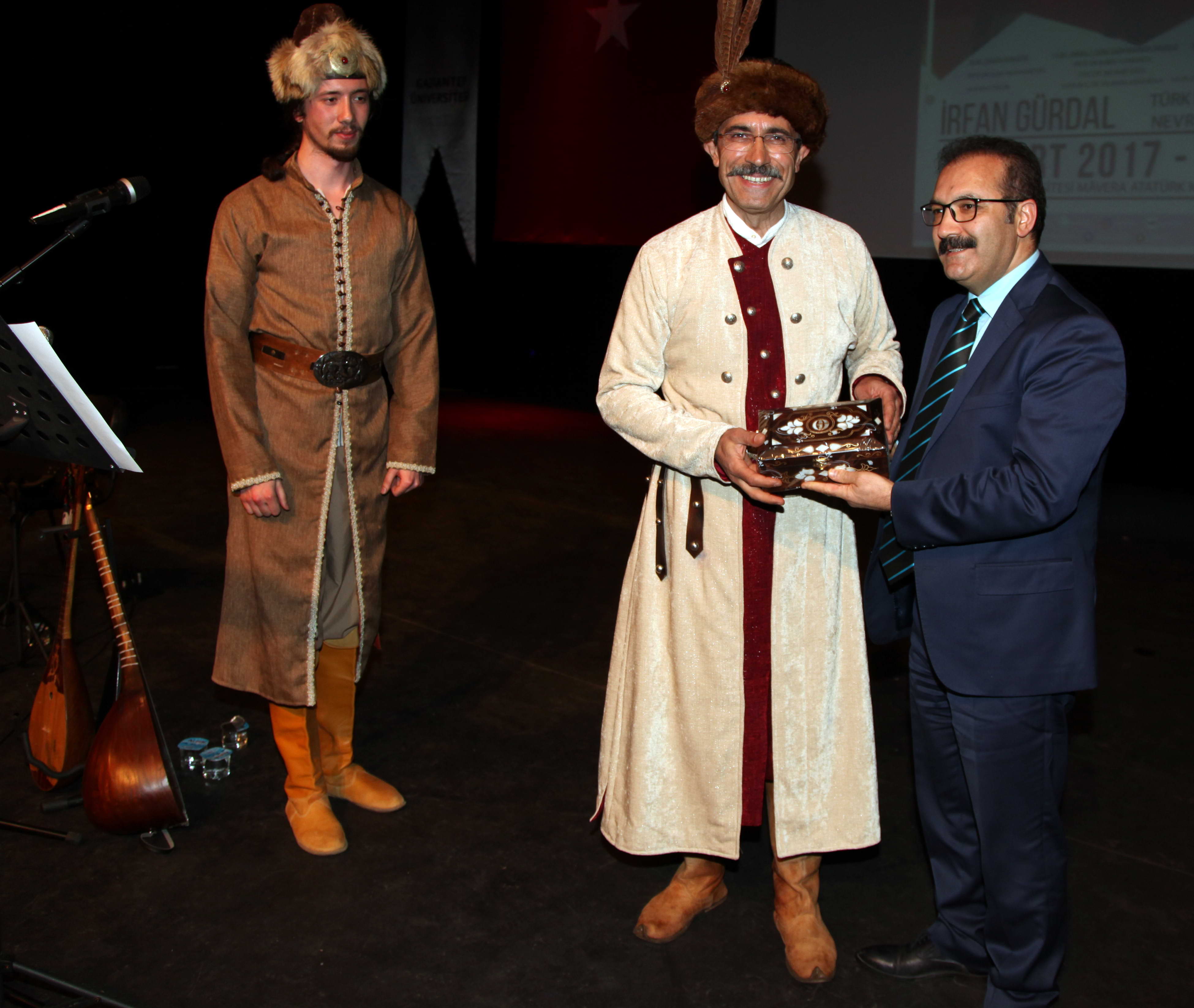 Konserin sonunda Rektör Prof. Dr. Ali Gür, Sanatçı İrfan Gürdal ve Şamil Ersöz’e gecenin anısına hediye takdim etti.